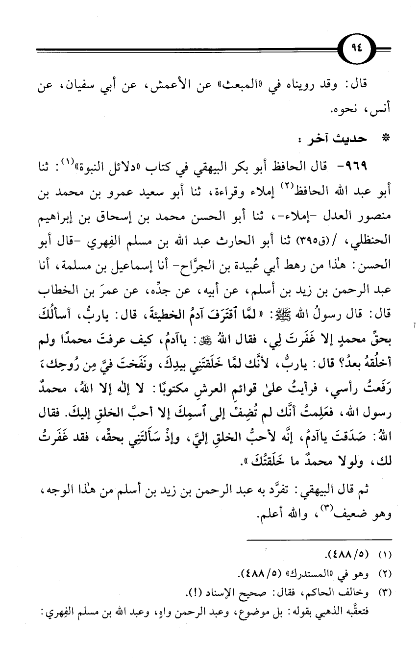 (969) قال الحافظ أبو بكر البيهقي في كتاب «دلائل النبوة» (¬1): ثنا أبو عبد الله الحافظ (¬2) إملاء وقراءة، ثنا أبو سعيد عمرو بن محمد بن منصور العدل -إملاء-، ثنا أبو الحسن محمد بن إسحاق بن إبراهيم الحنظلي، / (ق 395) ثنا أبو الحارث عبد الله بن مسلم الفِهري -قال أبو الحسن: هذا من رهط أبي عُبيدة بن الجرَّاح- أنا إسماعيل بن مسلمة، أنا عبد الرحمن بن زيد بن أسلم، عن أبيه، عن جدِّه، عن عمرَ بن الخطاب قال: قال رسولُ الله صلى الله عليه وسلم: «لمَّا اقتَرَفَ آدمُ الخطيئةَ، قال: ياربُّ، أسألُكَ بحقِّ محمدٍ إلا غَفَرتَ لِي، فقال اللهُ عزَّ وجلَّ: ياآدمُ، كيف عرفتَ محمدًا ولم أخلُقهُ بعدُ؟ قال: ياربُّ، لأنَّك لمَّا خَلَقتَنِي بيدِكَ، ونَفَختَ فيَّ مِن رُوحِك، رَفَعتُ رأسي، فرأيتُ على قوائمِ العرشِ مكتوبًا: لا إلهَ إلا اللهُ، محمدٌ رسول الله، فعَلِمتُ أنَّك لم تُضِفْ إلى اسمِكَ إلا أحبَّ الخلقِ إليكَ. فقال اللهُ: صَدَقتَ ياآدمُ، إنَّه لأحبُّ الخلقِ إليَّ، وإذْ سَأَلتَنِي بحقِّه، فقد غَفَرتُ لك، ولولا محمدٌ ما خَلَقتُكَ».
