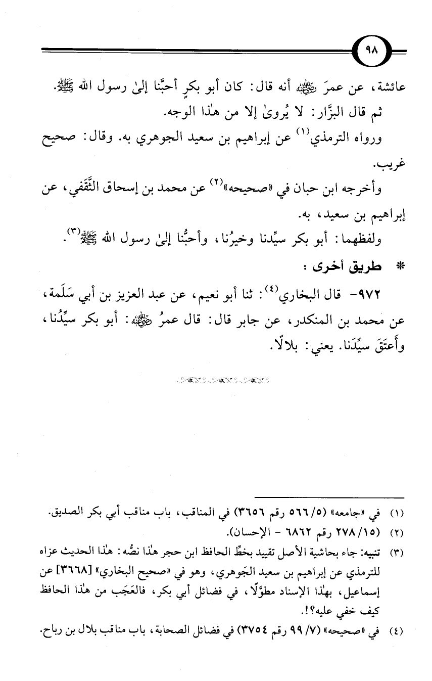 (972) قال البخاري (¬4): ثنا أبو نعيم، عن عبد العزيز بن أبي سَلَمة، عن محمد بن المنكدر، عن جابر قال: قال عمرُ رضي الله عنه: أبو بكر سيِّدُنا، وأَعتَقَ سيِّدَنا. يعني: بلالاً.