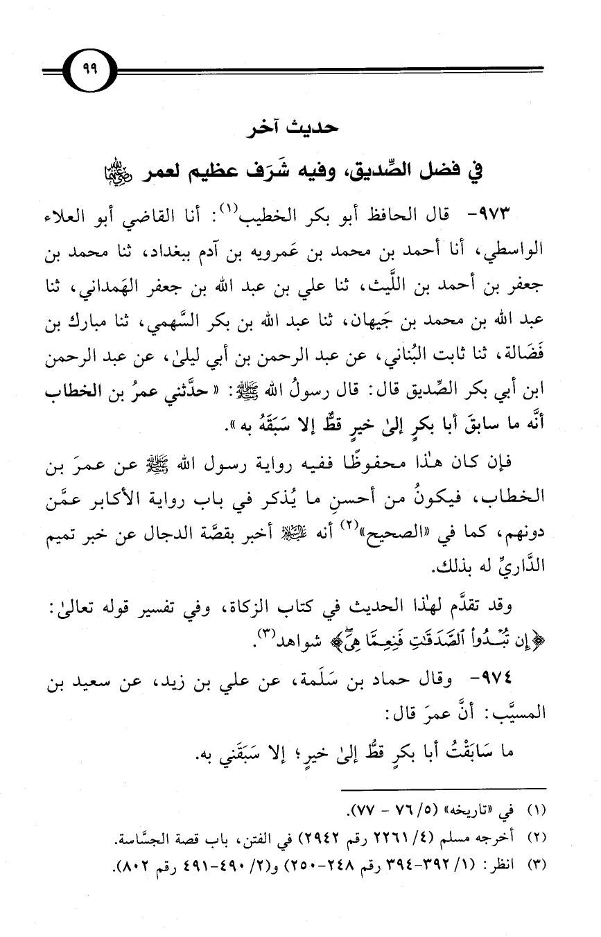 (973) قال الحافظ أبو بكر الخطيب (¬1): أنا القاضي أبو العلاء الواسطي، أنا أحمد بن محمد بن عَمرويه بن آدم ببغداد، ثنا محمد بن جعفر بن أحمد بن اللَّيث، ثنا علي بن عبد الله بن جعفر الهَمداني، ثنا عبد الله بن محمد بن جَيهان، ثنا عبد الله بن بكر السَّهمي، ثنا مبارك بن فَضَالة، ثنا ثابت البُناني، عن عبد الرحمن بن أبي ليلى، عن عبد الرحمن بن أبي بكر الصِّديق قال: قال رسولُ الله صلى الله عليه وسلم: «حدَّثني عمرُ بن الخطاب أنَّه ما سابقَ أبا بكرٍ إلى خيرٍ قطٌّ إلا سَبَقَهُ به».