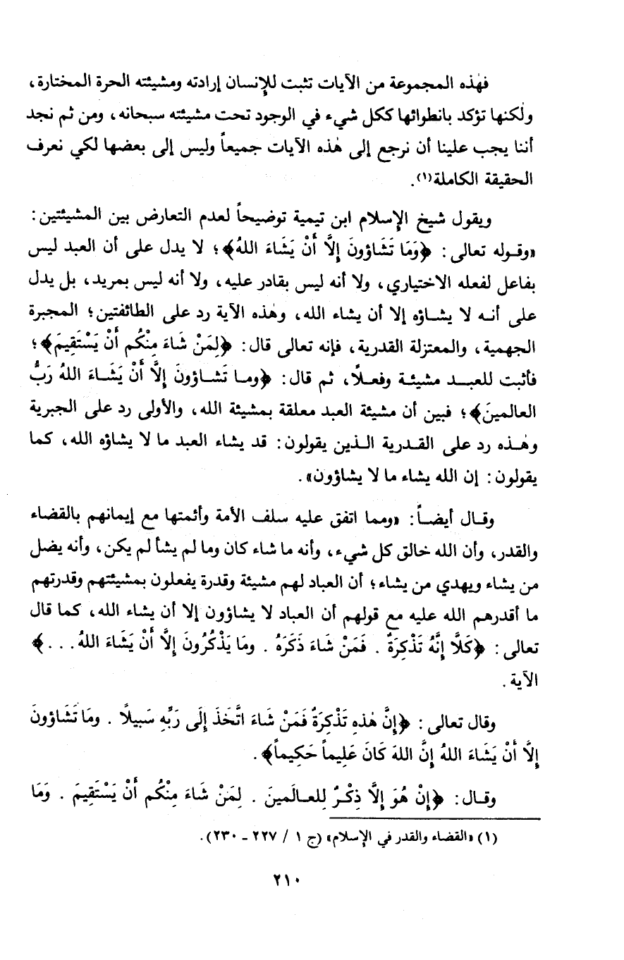 فَهَذِهِ الْمَجْمُوعَة من الْآيَات تثبت للْإنْسَان إِرَادَته ومشيئته الْحرَّة المختارة وَلكنهَا تؤكد بانطوائها ككل شَيْء فِي الْوُجُود تَحت مَشِيئَته سُبْحَانَهُ وَمن ثمَّ نجد أننا يجب علينا أَن نرْجِع إِلَى هَذِه الْآيَات جَمِيعًا وَلَيْسَ إِلَى بَعْضهَا لكَي نَعْرِف الْحَقِيقَة الْكَامِلَة
