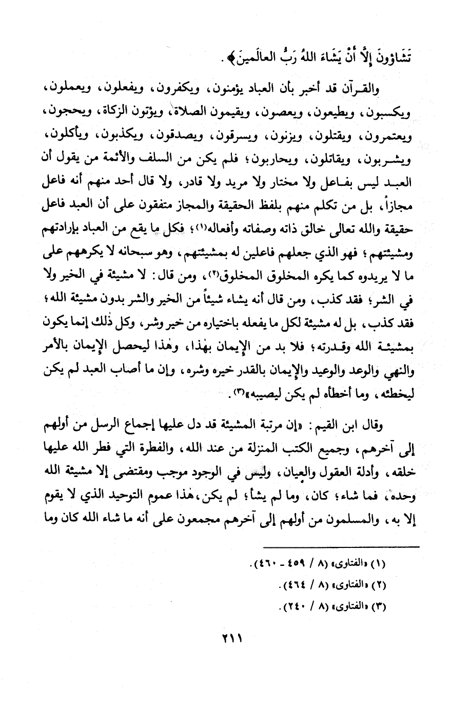 وَقَالَ ابْن الْقيم إِن مرتبَة الْمَشِيئَة قد دلّ عَلَيْهَا إِجْمَاع الرُّسُل من أَوَّلهمْ إِلَى آخِرهم وَجَمِيع الْكتب الْمنزلَة من عِنْد الله والفطرة الَّتِي فطر الله عَلَيْهَا خلقه وأدلة الْعُقُول والعيان وَلَيْسَ فِي الْوُجُود مُوجب وَمُقْتَضى إِلَّا مَشِيئَة الله وَحده فَمَا شَاءَ كَانَ وَمَا لم يَشَأْ لم يكن هَذَا عُمُوم التَّوْحِيد الَّذِي لَا يقوم إِلَّا بِهِ والمسلمون من أَوَّلهمْ إِلَى آخِرهم مجمعون على أَنه مَا شَاءَ الله كَانَ وَمَا