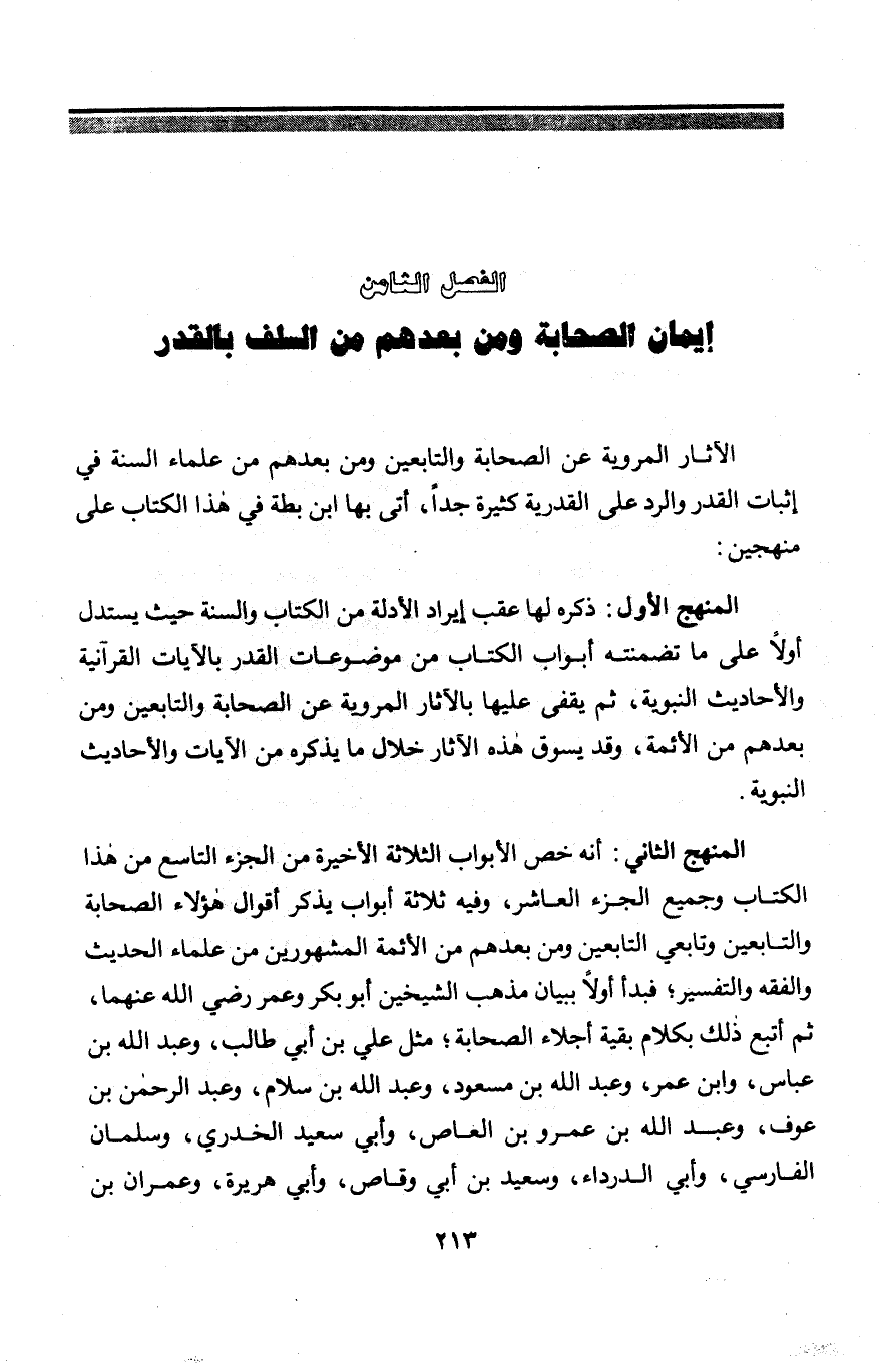 الْمنْهَج الأول ذكره لَهَا عقب إِيرَاد الْأَدِلَّة من الْكتاب وَالسّنة حَيْثُ يسْتَدلّ أَولا على مَا تضمنته أَبْوَاب الْكتاب من مَوْضُوعَات الْقدر بِالْآيَاتِ القرآنية وَالْأَحَادِيث النَّبَوِيَّة ثمَّ يقفى عَلَيْهَا بالآثار المروية عَن الصَّحَابَة وَالتَّابِعِينَ وَمن بعدهمْ من الْأَئِمَّة وَقد يَسُوق هَذِه الْآثَار خلال مَا يذكرهُ من الْآيَات وَالْأَحَادِيث النَّبَوِيَّة