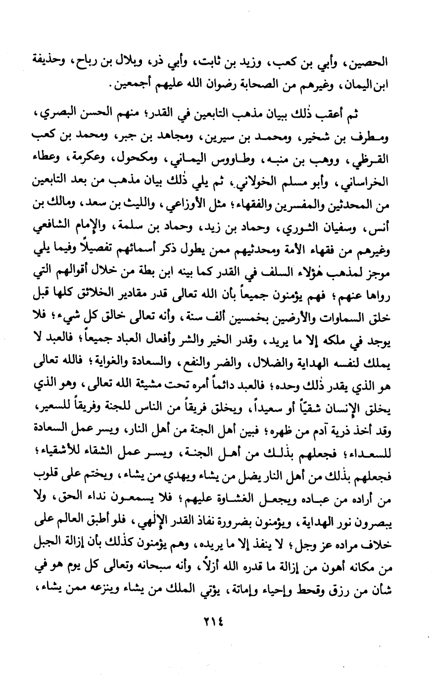 ثمَّ أعقب ذَلِك بِبَيَان مَذْهَب التَّابِعين فِي الْقدر مِنْهُم الْحسن الْبَصْرِيّ ومطرف بن شخير وَمُحَمّد بن سِيرِين وَمُجاهد بن جبر وَمُحَمّد بن كَعْب الْقرظِيّ ووهب بن مُنَبّه وطاووس الْيَمَانِيّ وَمَكْحُول وَعِكْرِمَة وَعَطَاء الْخُرَاسَانِي وَأَبُو مُسلم الْخَولَانِيّ ثمَّ يَلِي ذَلِك بَيَان مَذْهَب من بعد التَّابِعين من الْمُحدثين والمفسرين وَالْفُقَهَاء مثل الْأَوْزَاعِيّ وَاللَّيْث بن سعد وَمَالك بن أنس وسُفْيَان الثَّوْريّ وَحَمَّاد بن زيد وَحَمَّاد بن سَلمَة وَالْإِمَام الشَّافِعِي وَغَيرهم من فُقَهَاء الْأمة ومحدثيهم مِمَّن يطول ذكر أسمائهم تَفْصِيلًا وَفِيمَا يَلِي موجز لمَذْهَب هَؤُلَاءِ السّلف فِي الْقدر كَمَا بَينه ابْن بطة من خلال أَقْوَالهم الَّتِي رَوَاهَا عَنْهُم فهم يُؤمنُونَ جَمِيعًا بِأَن الله تَعَالَى قدر مقادير الْخَلَائق كلهَا قبل خلق السَّمَاوَات وَالْأَرضين بِخَمْسِينَ ألف سنة وَأَنه تَعَالَى خَالق كل شَيْء فَلَا يُوجد فِي ملكه إِلَّا مَا يُرِيد وَقدر الْخَيْر وَالشَّر وأفعال الْعباد جَمِيعًا فَالْعَبْد لَا يملك لنَفسِهِ الْهِدَايَة والضلال والضر والنفع والسعادة والغواية فَالله تَعَالَى هُوَ الَّذِي يقدر ذَلِك وَحده فَالْعَبْد دَائِما أمره تَحت مَشِيئَة الله تَعَالَى وَهُوَ الَّذِي يخلق الْإِنْسَان شقيا أَو سعيدا ويخلق فريقا من النَّاس للجنة وفريقا للسعير وَقد أَخذ ذُرِّيَّة آدم من ظَهره فَبين أهل الْجنَّة من أهل النَّار وَيسر عمل السَّعَادَة للسعداء فجعلهم بذلك من أهل الْجنَّة وَيسر عمل الشَّقَاء للأشقياء فجعلهم بذلك من أهل النَّار يضل من يَشَاء وَيهْدِي من يَشَاء وَيخْتم على قُلُوب من أَرَادَهُ من عباده وَيجْعَل الغشاوة عَلَيْهِم فَلَا يسمعُونَ نِدَاء الْحق وَلَا يبصرون نور الْهِدَايَة ويؤمنون بضرورة نَفاذ الْقدر الإلهي فَلَو أطبق الْعَالم على خلاف مُرَاده عز وَجل لَا ينفذ إِلَّا مَا يُريدهُ وهم يُؤمنُونَ كَذَلِك بَان إِزَالَة الْجَبَل من مَكَانَهُ أَهْون من إِزَالَة مَا قدره الله أزلا وانه سُبْحَانَهُ وَتَعَالَى كل يَوْم هُوَ فِي شَأْن من رزق وقحط وإحياء وإماتة يُؤْتِي الْملك من يَشَاء وينزعه مِمَّن يَشَاء