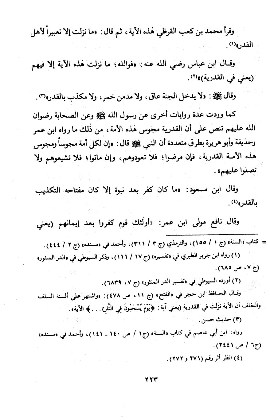 كَمَا وَردت عدَّة رِوَايَات أُخْرَى عَن رَسُول الله صلى الله عَلَيْهِ وَسلم وَعَن الصَّحَابَة رضوَان الله عَلَيْهِم تنص على أَن الْقَدَرِيَّة مجوس هَذِه الْأمة من ذَلِك مَا رَوَاهُ ابْن عمر وَحُذَيْفَة وَأَبُو هُرَيْرَة بطرق مُتعَدِّدَة ان النَّبِي صلى الله عَلَيْهِ وَسلم قَالَ إِن لكل أمة مجوسا ومجوس هَذِه الْأمة الْقَدَرِيَّة فَإِن مرضوا فَلَا تعودوهم وَإِن مَاتُوا فَلَا تشيعوهم وَلَا تصلوا عَلَيْهِم