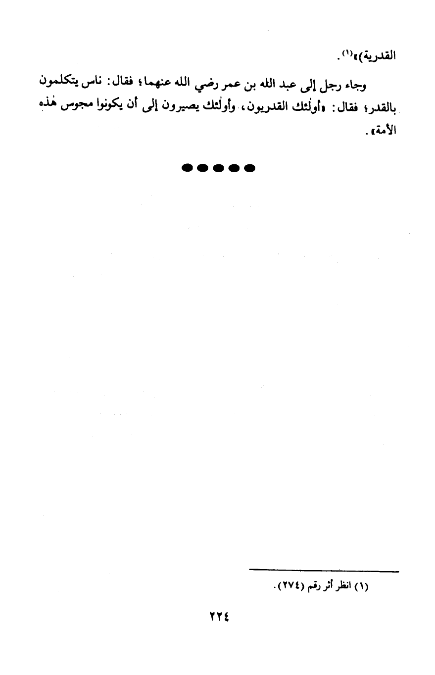 وَجَاء رجل إِلَى عبد الله بن عمر رَضِي الله عَنْهُمَا فَقَالَ نَاس يَتَكَلَّمُونَ بِالْقدرِ فَقَالَ أُولَئِكَ القدريون وَأُولَئِكَ يصيرون إِلَى أَن يَكُونُوا مجوس هَذِه الْأمة