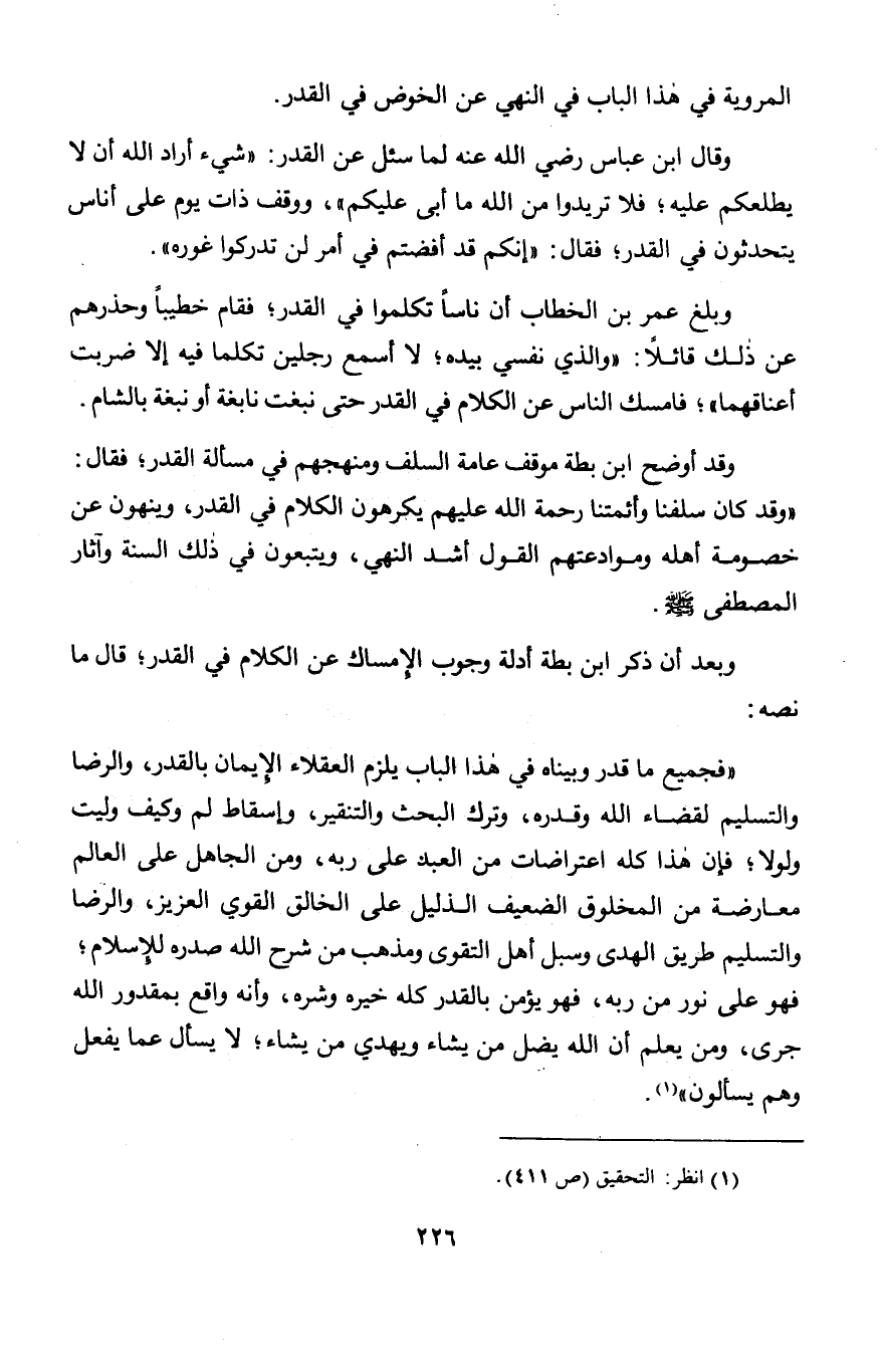 وَبعد ان ذكر ابْن بطة ادلة وجوب الْإِمْسَاك عَن الْكَلَام فِي الْقدر قَالَ مَا نَصه
