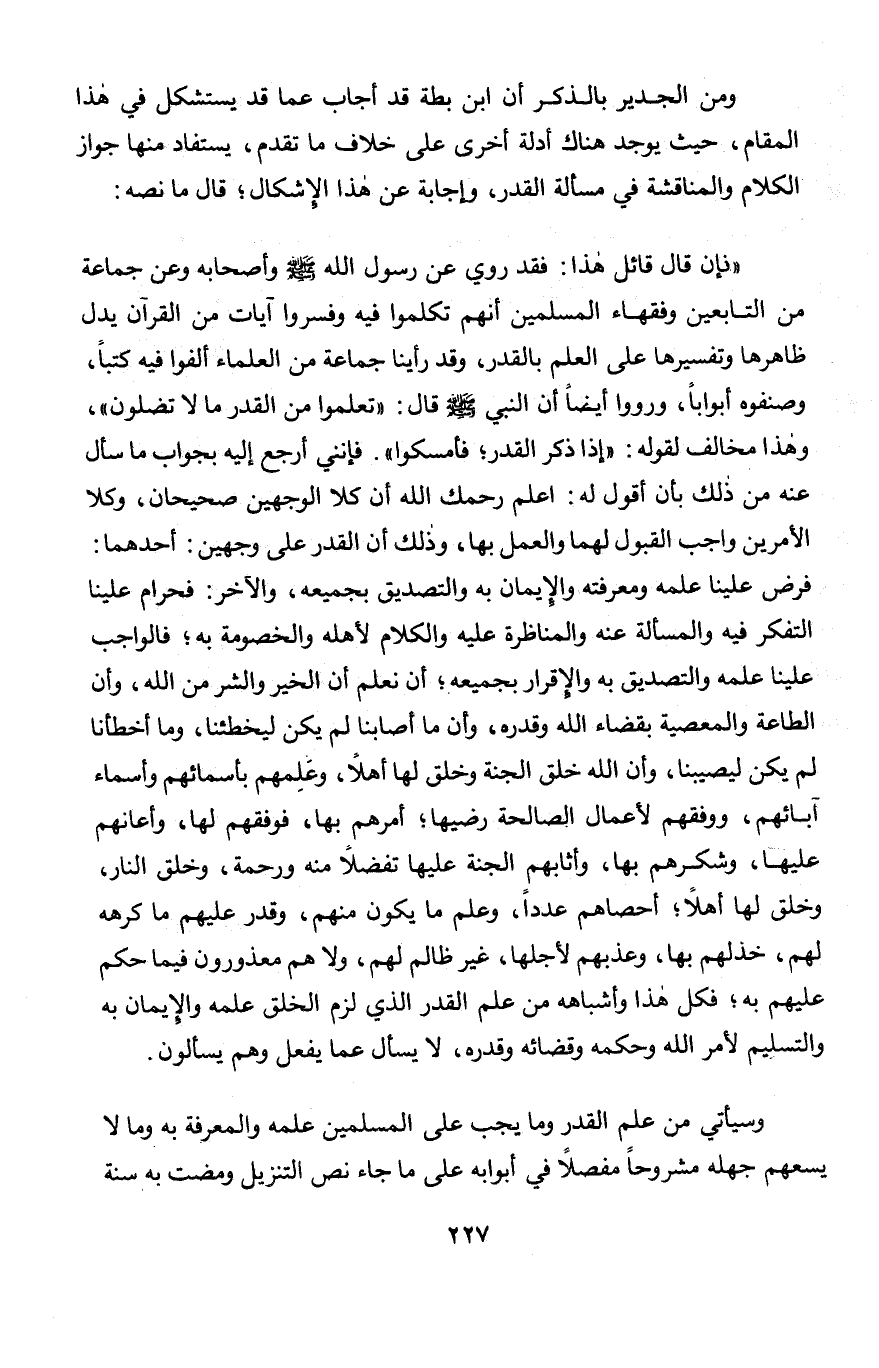 وَمن الجدير بِالذكر أَن ابْن بطة قد أجَاب عَمَّا قد يسْتَشْكل فِي هَذَا الْمقَام حَيْثُ يُوجد هُنَاكَ أَدِلَّة أُخْرَى على خلاف مَا تقدم يُسْتَفَاد مِنْهَا جَوَاز الْكَلَام والمناقشة فِي مَسْأَلَة الْقدر وَإجَابَة عَن هَذَا الْإِشْكَال قَالَ مَا نَصه