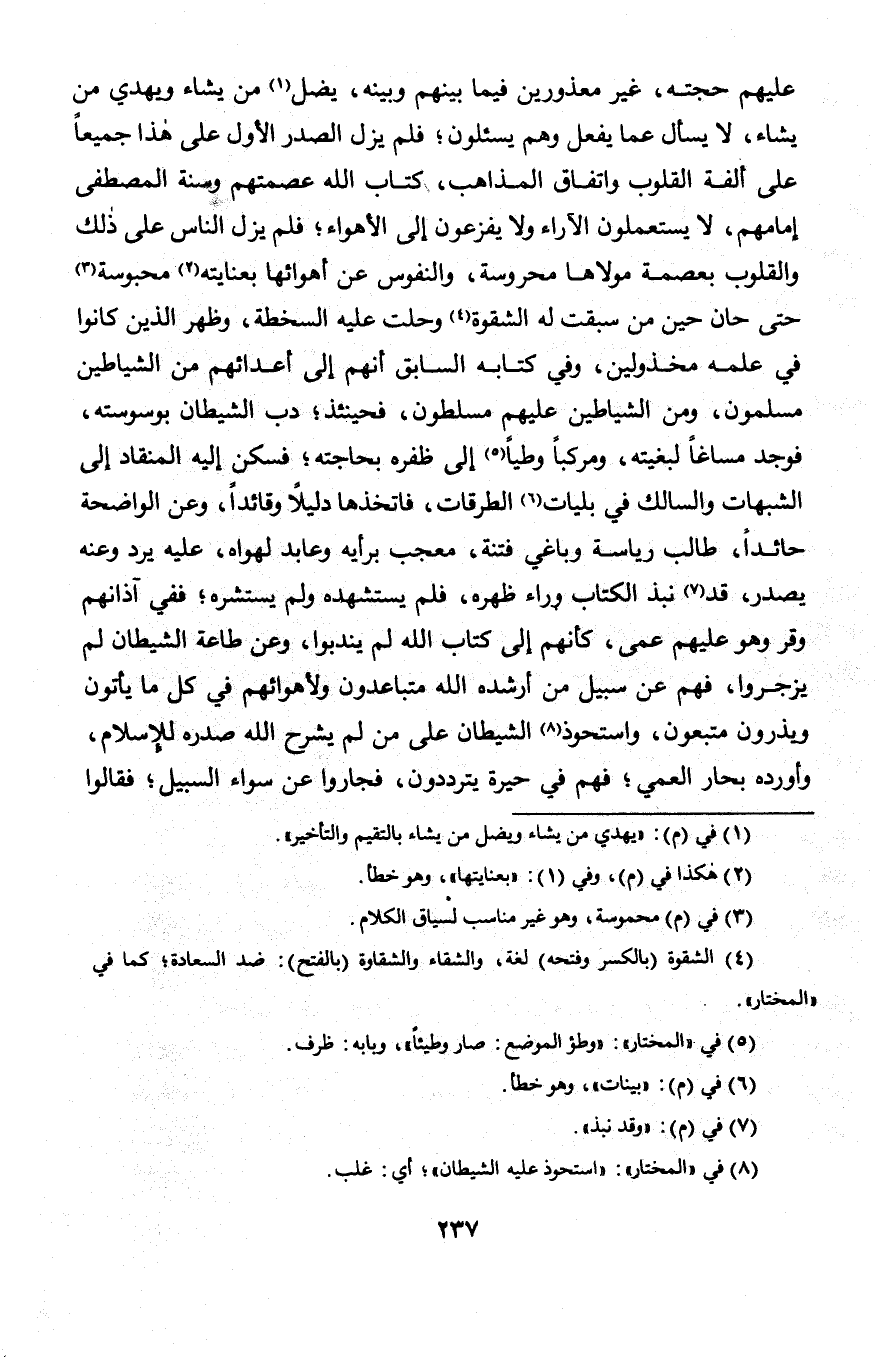 عَلَيْهِمْ حُجَّتُهُ غَيْرَ مَعْذُورِينَ فِيمَا بَيْنَهُمْ وَبَيْنَهُ، يُضِلُّ مَنْ يَشَاءُ وَيَهْدِي مَنْ يَشَاءُ , لَا يُسْأَلُ عَمَّا يَفْعَلُ وَهُمْ يُسْأَلُونَ , فَلَمْ يَزَلِ الصَّدْرُ الْأَوَّلُ عَلَى هَذَا جَمِيعًا عَلَى أُلْفَةِ الْقُلُوبِ وَاتِّفَاقِ الْمَذَاهِبِ , كِتَابُ اللَّهِ عِصْمَتُهُمْ، وَسُنَّةُ الْمُصْطَفَى إِمَامُهُمْ , لَا يَسْتَعْمِلُونَ الْآرَاءَ وَلَا يَفْزَعُونَ إِلَى الْأَهْوَاءِ , فَلَمْ يَزَلِ النَّاسُ عَلَى ذَلِكَ , وَالْقُلُوبِ بِعِصْمَةِ مَوْلَاهَا مَحْرُوسَةٌ , وَالنُّفُوسُ عَنْ أَهْوَائِهَا بِعِنَايَتِهِ مَحْبُوسَةٌ حَتَّى حَانَ حِينُ مَنْ سَبَقَتْ لَهُ الشِّقْوَةُ وَحَلَّتْ عَلَيْهِ السَّخْطَةُ , وَظَهَرَ الَّذِينَ كَانُوا فِي عِلْمِهِ مَخْذُولِينَ , وَفِي كِتَابِهِ السَّابِقِ أَنَّهُمْ إِلَى أَعْدَائِهِمْ مِنَ الشَّيَاطِينِ مُسَلِّمُونَ , وَمِنَ الشَّيَاطِينِ عَلَيْهِمْ مُسَلَّطُونَ , فَحِينَئِذٍ دَبَّ الشَّيْطَانُ بِوَسْوَسَتِهِ , فَوَجَدَ مَسَاغًا لِبُغْيَتِهِ , وَمَرْكِبًا وَطِيًّا إِلَى ظَفَرِهِ بِحَاجَتِهِ , فَسَكَنَ إِلَيْهِ الْمُنْقَادُ إِلَى الشُّبُهَاتِ وَالسَّالِكُ فِي بَلِيَّاتِ الطُّرُقَاتِ , فَاتَّخَذَهَا دَلِيلًا وَقَائِدًا , وَعَنِ الْوَاضِحَةِ حَائِدًا , طَالِبُ رِيَاسَةٍ , وَبَاغِي فِتْنَةٍ , مُعْجَبٌ بِرَأْيِهِ وَعَابِدٌ لِهَوَاهُ , عَلَيْهِ يَرِدُ وَعَنْهُ يَصْدُرُ , قَدْ نَبَذَ الْكِتَابَ وَرَاءَ ظَهْرِهِ , فَلَمْ يَسْتَشْهِدْهُ وَلَمْ يَسْتَشِرْهُ , فَفِي آذَانِهِمْ وَقَرٌ وَهُوَ عَلَيْهِمْ عَمًى , كَأَنَّهُمْ إِلَى كِتَابِ اللَّهِ لَمْ يُنْدَبُوا , وَعَنْ طَاعَةِ الشَّيْطَانِ لَمْ يُزْجَرُوا , فَهُمْ عَنْ سَبِيلِ مَنْ أَرْشَدَهُ اللَّهِ مُتَبَاعِدُونَ، وَلِأَهْوَائِهِمْ فِي كُلِّ مَا يَأْتُونَ وَيَذَرُونَ مُتَّبِعُونَ , وَاسْتَحْوَذَ الشَّيْطَانُ عَلَى مَنْ لَمْ يَشْرَحِ اللَّهُ صَدْرَهُ لِلْإِسْلَامِ وَأَوْرَدَهُ بِحَارَ الْعَمَى , فَهُمْ فِي حَيْرَةٍ يَتَرَدَّدُونَ , فَجَارُوا عَنْ سَوَاءِ السَّبِيلِ , فَقَالُوا