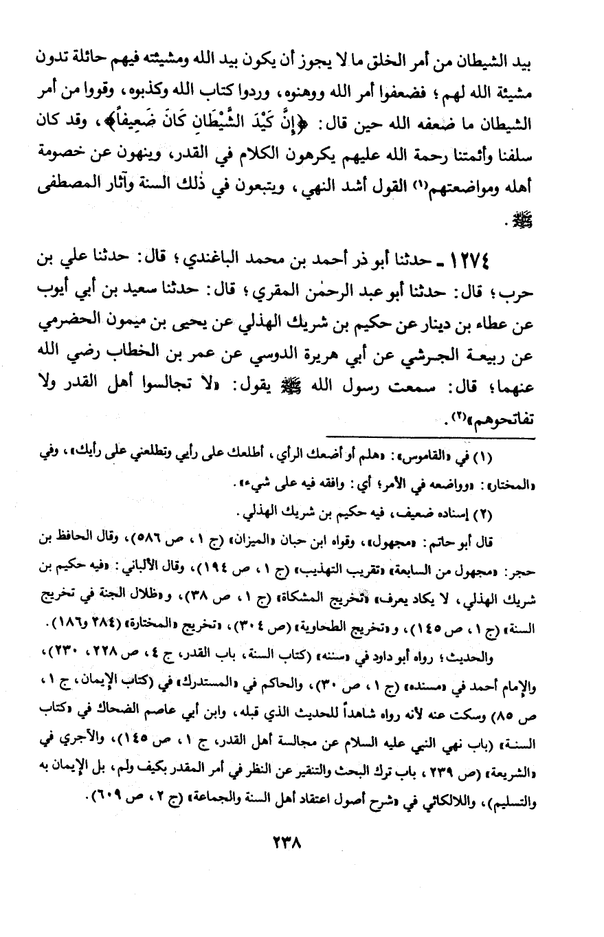 بِيَدِ الشَّيْطَانِ مِنْ أَمْرِ الْخَلْقِ مَا لَا يَجُوزُ أَنْ يَكُونَ بِيَدِ اللَّهِ، وَمَشِيئَتُهُ فِيهِمْ حَائِلَةٌ تُدَوِّنُ مَشِيئَةَ اللَّهِ لَهُمْ , فَضَعَّفُوا أَمْرَ اللَّهِ وَوَهَّنُوهُ , وَرَدُّوا كِتَابَ اللَّهِ وَكَذَّبُوهُ , وَقَوَوْا مِنْ أَمْرِ الشَّيْطَانِ مَا ضَعَّفَهُ اللَّهُ حِينَ قَالَ {إِنَّ كَيْدَ الشَّيْطَانِ كَانَ ضَعِيفًا} [النساء: 76] وَقَدْ كَانَ سَلَفُنَا وَأَئِمَّتُنَا رَحْمَةُ اللَّهِ عَلَيْهِمْ يَكْرَهُونَ الْكَلَامَ فِي الْقَدَرِ , وَيَنْهَوْنَ عَنْ خُصُومَةِ أَهْلِهِ وَمُوَاضَعَتِهِمُ الْقَوْلَ أَشَدَّ النَّهْيِ , وَيَتَّبِعُونَ فِي ذَلِكَ السُّنَّةَ وَآثَارَ الْمُصْطَفَى صَلَّى اللَّهُ عَلَيْهِ وَسَلَّمَ.