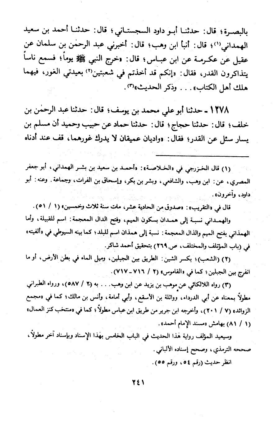 1278 - حَدَّثَنَا أَبُو عَلِيٍّ مُحَمَّدُ بْنُ يُوسُفَ قَالَ: حَدَّثَنَا عَبْدُ الرَّحْمَنِ بْنُ خَلَفٍ , قَالَ: حَدَّثَنَا حَجَّاجٌ , قَالَ: حَدَّثَنَا حَمَّادٌ , عَنْ حَبِيبٍ , وَحُمَيْدٍ , أَنَّ مُسْلِمَ بْنَ يَسَارٍ , §سُئِلَ عَنِ الْقَدَرِ , فَقَالَ: وَادِيَانِ عَمِيقَانِ لَا يُدْرَكُ غَوْرُهُمَا، قِفْ عِنْدَ أَدْنَاهُ , -[242]- وَاعْمَلْ عَمَلَ رَجُلٍ يَعْلَمُ أَنَّهُ يُجْزَى بِعَمَلِهِ , وَتَوَكَّلْ تَوَكُّلَ رَجُلٍ يَعْلَمُ أَنَّهُ لَنْ يُصِيبَهُ إِلَّا مَا كَتَبَ اللَّهُ لَهُ "