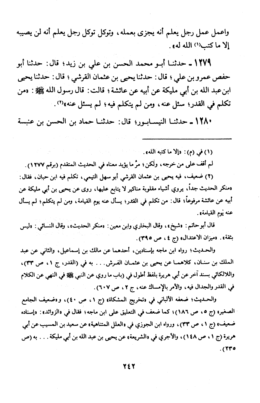 1279 - حَدَّثَنَا أَبُو مُحَمَّدٍ الْحَسَنُ بْنُ عَلِيِّ بْنِ زَيْدٍ , قَالَ: حَدَّثَنَا أَبُو حَفْصٍ عَمْرُو بْنُ عَلِيٍّ قَالَ: حَدَّثَنَا يَحْيَى بْنُ عُثْمَانَ الْقُرَشِيُّ , قَالَ: حَدَّثَنَا يَحْيَى بْنُ عَبْدِ اللَّهِ بْنِ أَبِي مُلَيْكَةَ , عَنْ أَبِيهِ , عَنْ عَائِشَةَ , قَالَتْ: قَالَ رَسُولُ اللَّهِ صَلَّى اللَّهُ عَلَيْهِ وَسَلَّمَ: § «مَنْ تَكَلَّمَ فِي الْقَدَرِ سُئِلَ عَنْهُ , وَمَنْ لَمْ يَتَكَلَّمْ فِيهِ لَمْ يُسْأَلْ عَنْهُ»