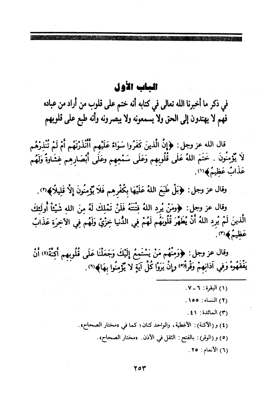 §الْبَابُ الْأَوَّلُ فِي ذِكْرِ مَا أَخْبَرَنَا اللَّهُ تَعَالَى فِي كِتَابِهِ أَنَّهُ خَتَمَ عَلَى قُلُوبِ مَنْ أَرَادَ مِنْ عِبَادِهِ فَهُمْ لَا يَهْتَدُونَ إِلَى الْحَقِّ وَلَا يَسْمَعُونَهُ وَلَا يُبْصِرُونَهُ وَأَنَّهُ طَبَعَ عَلَى قُلُوبِهِمْ قَالَ اللَّهُ عَزَّ وَجَلَّ {إِنَّ الَّذِينَ كَفَرُوا سَوَاءٌ عَلَيْهِمْ أَأَنْذَرْتَهُمْ أَمْ لَمْ تُنْذِرْهُمْ لَا يُؤْمِنُونَ خَتَمَ اللَّهُ عَلَى قُلُوبِهِمْ وَعَلَى سَمْعِهِمْ وَعَلَى أَبْصَارِهِمْ غِشَاوَةٌ وَلَهُمْ عَذَابٌ عَظِيمٌ} [البقرة: 7]. وَقَالَ عَزَّ وَجَلَّ {بَلْ طَبَعَ اللَّهُ عَلَيْهَا بِكُفْرِهِمْ فَلَا يُؤْمِنُونَ إِلَّا قَلِيلًا} [النساء: 155]. وَقَالَ عَزَّ وَجَلَّ {وَمَنْ يُرِدِ اللَّهُ فِتْنَتَهُ فَلَنْ تَمْلِكَ لَهُ مِنَ اللَّهِ شَيْئًا أُولَئِكَ الَّذِينَ لَمْ يُرِدِ اللَّهُ أَنْ يُطَهِّرَ قُلُوبَهُمْ لَهُمْ فِي الدُّنْيَا خِزْيٌ وَلَهُمْ فِي الْآخِرَةِ عَذَابٌ عَظِيمٌ} [المائدة: 41]. وَقَالَ عَزَّ وَجَلَّ {وَمِنْهُمْ مَنْ يَسْتَمِعُ إِلَيْكَ وَجَعَلْنَا عَلَى قُلُوبِهِمْ أَكِنَّةً أَنْ يَفْقَهُوهُ وَفِي آذَانِهِمْ وَقْرًا وَإِنْ يَرَوْا كُلَّ آيَةٍ لَا يُؤْمِنُوا بِهَا} [الأنعام: 25].