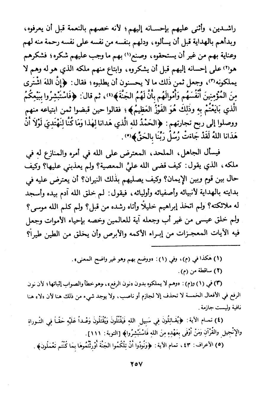 رَاشِدِينَ , وَأَثْنَى عَلَيْهِمْ بِإِحْسَانِهِ إِلَيْهِمْ لِأَنَّهُ خَصَّهُمْ بِالنِّعْمَةِ قَبْلَ أَنْ يَعْرَفُوهُ , وَبَدَأَهُمْ بِالْهِدَايَةِ قَبْلَ أَنْ يَسْأَلُوهُ , وَدَلَّهُمْ بِنَفْسِهِ مِنْ نَفْسِهِ عَلَى نَفْسِهِ رَحْمَةً مِنْهُ لَهُمْ وَعِنَايَةً بِهِمْ مِنْ غَيْرِ أَنْ يَسْتَحِقُّوهُ , وَصَنَعَ بِهِمْ مَا وَجَبَ عَلَيْهِمْ شَكْرُهُ , فَشَكَرَهُمْ هُوَ عَلَى إِحْسَانِهِ إِلَيْهِمْ قَبْلَ أَنْ يَشْكُرُوهُ , وَابْتَاعَ مِنْهُمْ مُلْكَهُ الَّذِي هُوَ لَهُ وَهُمْ لَا يَمْلِكُونَهُ , وَجَعَلَ ثَمَنَ ذَلِكَ مَا لَا يُحْسِنُونَ أَنْ يَطْلُبُوهُ , فَقَالَ {إِنَّ اللَّهَ اشْتَرَى مِنَ الْمُؤْمِنِينَ أَنْفُسَهُمْ وَأَمْوَالَهُمْ بِأَنَّ لَهُمُ الْجَنَّةَ} [التوبة: 111] ثُمَّ قَالَ {فاسْتَبْشِرُوا بِبَيْعِكُمُ الَّذِي بَايَعْتُمْ بِهِ وَذَلِكَ هُوَ الْفَوْزُ الْعَظِيمُ} [التوبة: 111] فَقَالُوا حِينَ قَبَضُوا ثَمَنَ ابْتِيَاعِهِ مِنْهُمْ وَوَصَلُوا إِلَى رِبْحِ تِجَارَتِهِمُ {الْحَمْدُ لِلَّهِ الَّذِي هَدَانَا لِهَذَا وَمَا كُنَّا لِنَهْتَدِيَ لَوْلَا أَنْ هَدَانَا اللَّهُ لَقَدْ جَاءَتْ رُسُلُ رَبِّنَا بِالْحَقِّ} [الأعراف: 43]. فَيَسْأَلُ الْجَاهِلُ الْمُلْحِدُ الْمُعْتَرِضُ عَلَى اللَّهِ فِي أَمْرِهِ وَالْمُنَازِعُ لَهُ فِي مُلْكِهِ الَّذِي يَقُولُ: كَيْفَ قَضَى اللَّهُ عَلَيَّ الْمَعْصِيَةَ؟ وَلِمَ يُعَذِّبُنِي عَلَيْهَا؟ وَكَيْفَ حَالَ بَيْنَ قَوْمٍ وَبَيْنَ الْإِيمَانِ؟ وَكَيْفَ يُصْلِيهِمْ بِذَلِكَ النِّيرَانَ؟ أَنْ يَعْتَرِضَ عَلَيْهِ فِي بِدَايَتِهِ بِالْهِدَايَةِ لِأَنْبِيَائِهِ وَأَصْفِيَائِهِ وَأَوْلِيَائِهِ , فَيَقُولَ: لِمَ خَلَقَ اللَّهُ آدَمَ بِيَدِهِ وَأَسْجَدَ لَهُ مَلَائِكَتَهُ؟ وَلِمَ اتَّخَذَ إِبْرَاهِيمَ خَلِيلًا وَأَتَاهُ رُشْدَهُ مِنْ قَبْلُ؟ وَلِمَ كَلَّمَ اللَّهُ مُوسَى؟ وَلِمَ خَلَقَ عِيسَى مِنْ غَيْرِ أَبٍ وَجَعَلَهُ آيَةً لِلْعَالَمِينَ وَخَصَّهُ بِإِحْيَاءِ الْأَمْوَاتِ وَجَعَلَ فِيهِ الْآيَاتِ الْمُعْجِزَاتِ مِنْ إِبْرَاءِ الْأَكْمَهِ وَالْأَبْرَصِ وَأَنْ يَخْلُقَ مِنَ الطِّينِ طَيْرًا؟