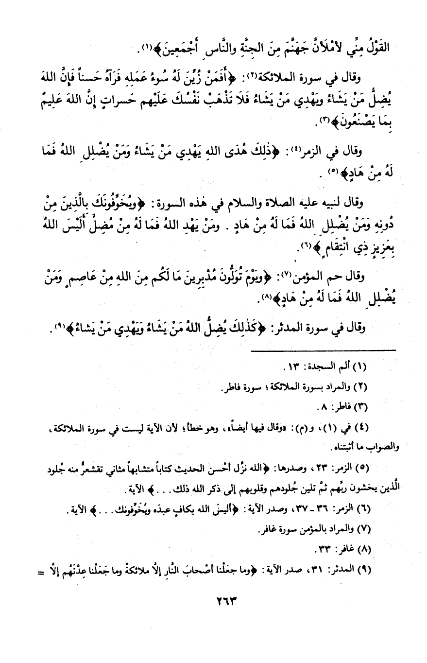 الْقَوْلُ مِنِّي لَأَمْلَأَنَّ جَهَنَّمَ مِنَ الْجِنَّةِ وَالنَّاسِ أَجْمَعِينَ} [السجدة: 13]. وَقَالَ فِي سُورَةِ الْمَلَائِكَةِ {أَفَمَنْ زُيِّنَ لَهُ سُوءُ عَمَلِهِ فَرَآهُ حَسَنًا فَإِنَّ اللَّهَ يُضِلُّ مَنْ يَشَاءُ وَيَهْدِي مَنْ يَشَاءُ فَلَا تَذْهَبْ نَفْسُكَ عَلَيْهِمْ حَسَرَاتٍ إِنَّ اللَّهَ عَلِيمٌ بِمَا يَصْنَعُونَ} [فاطر: 8]. وَقَالَ فِي الزُّمَرِ {ذَلِكَ هُدَى اللَّهِ يَهْدِي بِهِ مَنْ يَشَاءُ وَمَنْ يُضْلِلِ اللَّهُ فَمَا لَهُ مِنْ هَادٍ} [الزمر: 23]. وَقَالَ لِنَبِيِّهِ عَلَيْهِ الصَّلَاةُ وَالسَّلَامُ فِي هَذِهِ السُّورَةِ {وَيُخَوِّفُونَكَ بِالَّذِينَ مِنْ دُونِهِ وَمَنْ يُضْلِلِ اللَّهُ فَمَا لَهُ مِنْ هَادٍ وَمَنْ يَهْدِ اللَّهُ فَمَا لَهُ مِنْ مُضِلٍّ أَلَيْسَ اللَّهُ بِعَزِيزٍ ذِي انْتِقَامٍ} [الزمر: 36]. وَقَالَ فِي حم الْمُؤْمِنِ، {يَوْمَ تُوَلُّونَ مُدْبِرِينَ مَا لَكُمْ مِنَ اللَّهِ مِنْ عَاصِمٍ وَمَنْ يُضْلِلِ اللَّهُ فَمَا لَهُ مِنْ هَادٍ} [غافر: 33]. وَقَالَ فِي سُورَةِ الْمُدَّثِّرِ {كَذَلِكَ يُضِلُّ اللَّهُ مَنْ يَشَاءُ وَيَهْدِي مَنْ يَشَاءُ} [المدثر: 31].