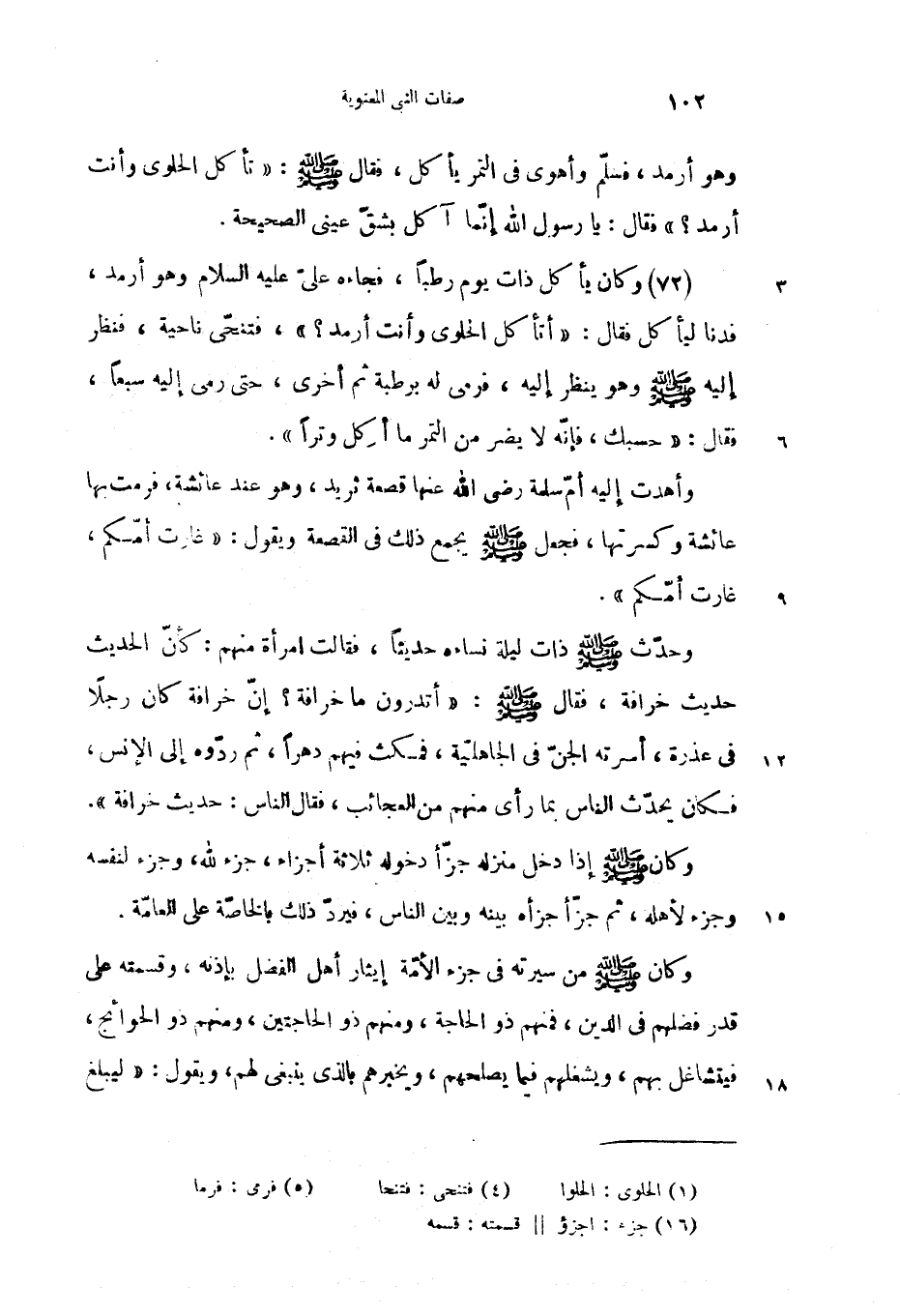 (72) وكان يأكل ذات يوم رطبا، فجاءه علىّ عليه السلام وهو أرمد، فدنا ليأكل فقال: «أتأ كل الحلوى وأنت أرمد؟»، فتنحّى ناحية، فنظر إليه صلّى الله عليه وسلم وهو ينظر إليه، فرمى له برطبة ثم أخرى، حتى رمى إليه سبعا، فقال: «حسبك، فإنّه لا يضر من التمر ما أكل وترا».