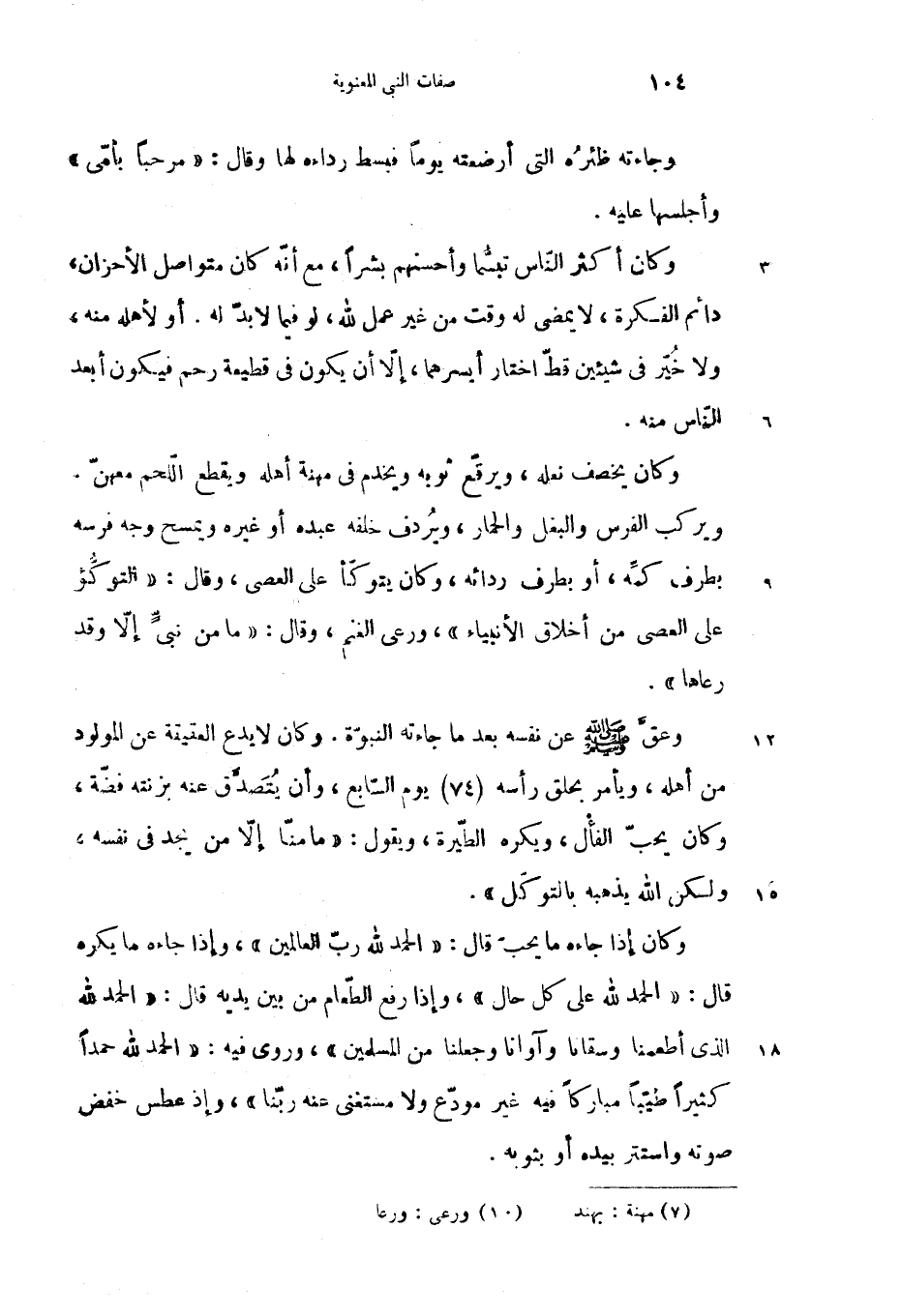 وكان يخصف نعله، ويرفّع ثوبه ويخدم فى مهنة أهله ويقطع اللّحم معهنّ.