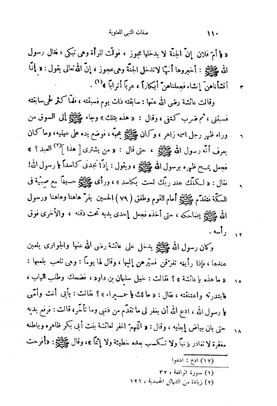 «يا أمّ فلان إنّ الجنّة لا يدخلها عجوز، فولّت المرأة وهى تبكى، فقال رسول الله صلّى الله عليه وسلم: أخبروها أنهّا لا تدخل الجنّة وهى عجوز، إنّ الله تعالى يقول: {إِنّا أَنْشَأْناهُنَّ إِنْشاءً فَجَعَلْناهُنَّ أَبْكاراً، عُرُباً أَتْراباً»} (1).