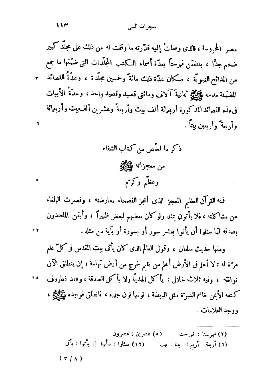فمنه القرآن العظيم المعجز الذى أعجز الفصحاء معارضته، وقصرت البلغاء عن مشاكلته، فلا يأتون بمثله ولو كان بعضهم لبعض ظهيرا، وأيقن الملحدون بصدقه لمّا سئلوا أن يأتوا بعشر سور أو بسورة أو بآية من مثله.