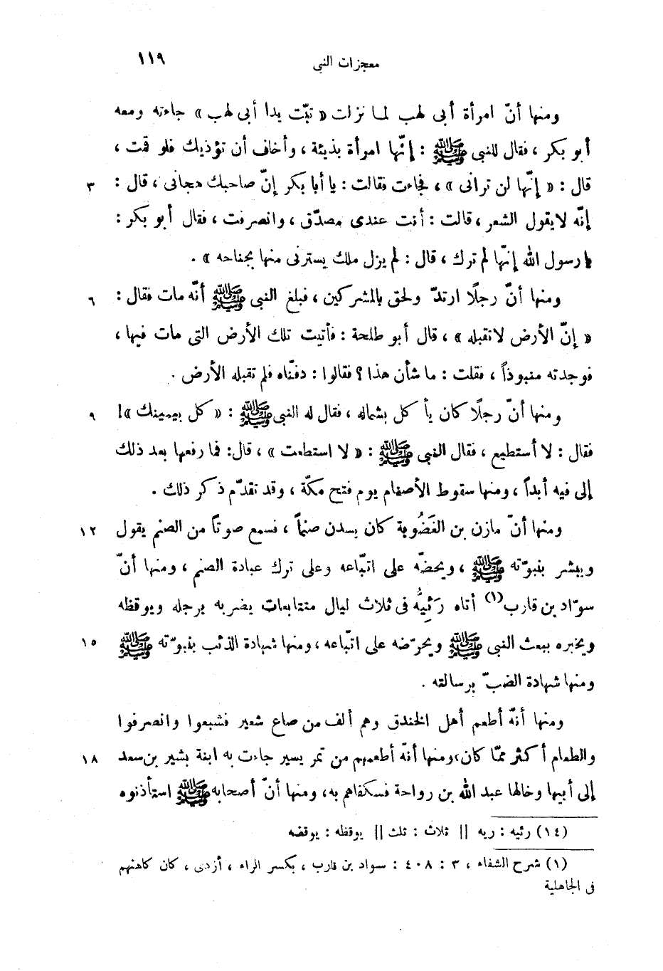 ومنها أنّه أطعم أهل الخندق وهم ألف من صاع شعير فشبعوا وانصرفوا والطعام أكثر ممّا كان، ومنها أنّه أطعمهم من تمر يسير جاءت به ابنة بشير بن سعد إلى أبيها وخالها عبد الله بن رواحة فسكفاهم به، ومنها أنّ أصحابه صلّى الله عليه وسلم استأذنوه
