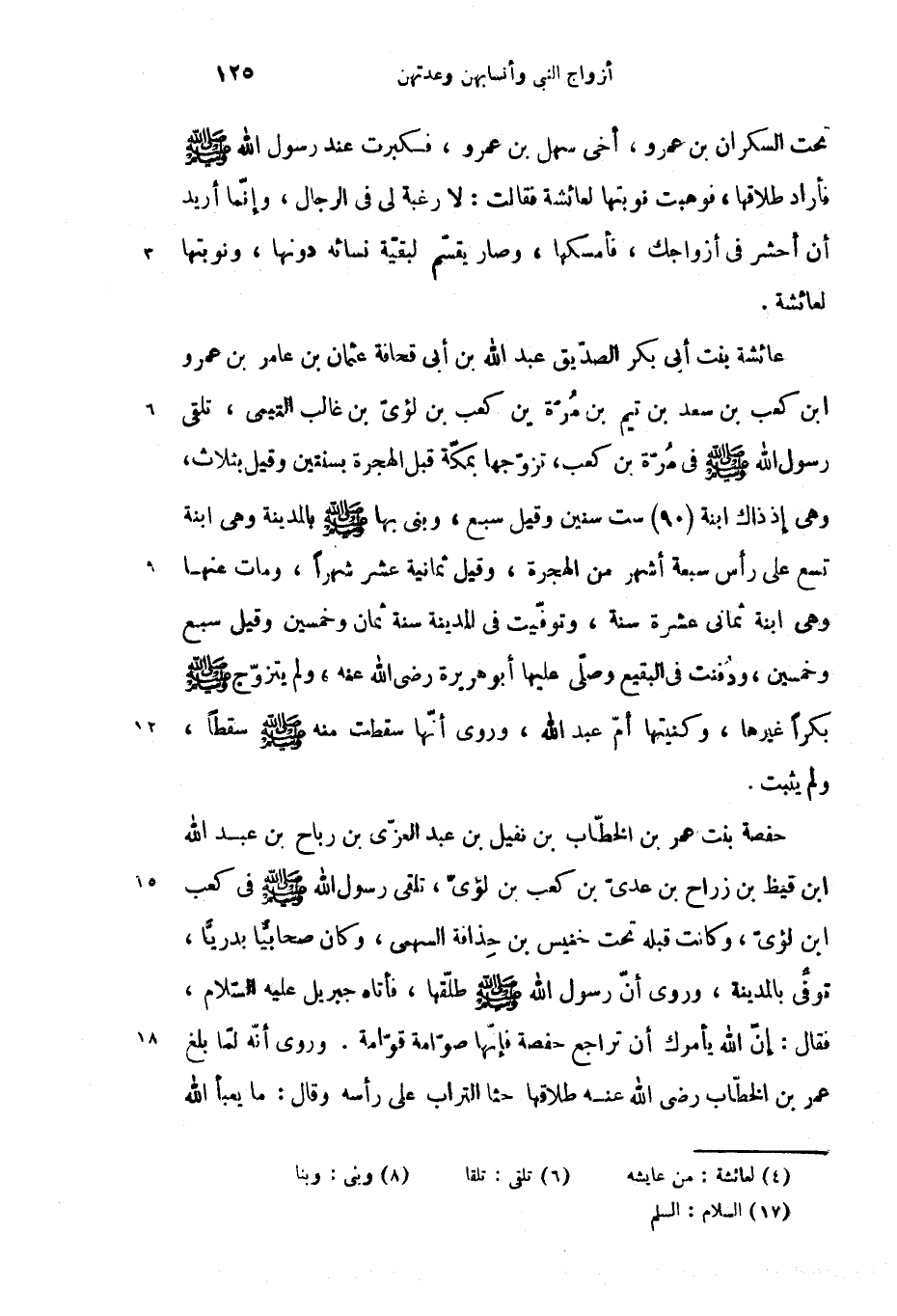 عائشة بنت أبى بكر الصدّيق عبد الله بن أبى قحافة عثمان بن عامر بن عمرو ابن كعب بن سعد بن تيم بن مرّة ين كعب بن لؤىّ بن غالب التيمى، تلقى رسول الله صلّى الله عليه وسلم فى مرّة بن كعب، تزوّجها بمكّة قبل الهجرة بسنتين وقيل بثلاث، وهى إذ ذاك ابنة (90) ست سنين وقيل سبع، وبنى بها صلّى الله عليه وسلم بالمدينة وهى ابنة تسع على رأس سبعة أشهر من الهجرة، وقيل ثمانية عشر شهرا، ومات عنها وهى ابنة ثمانى عشرة سنة، وتوفّيت فى المدينة سنة ثمان وخمسين وقيل سبع وخمسين، ودفنت فى البقيع وصلّى عليها أبو هريرة رضى الله عنه، ولم يتزوّج صلّى الله عليه وسلم بكرا غيرها، وكنيتها أمّ عبد الله، وروى أنّها سقطت منه صلّى الله عليه وسلم سقطا، ولم يثبت.