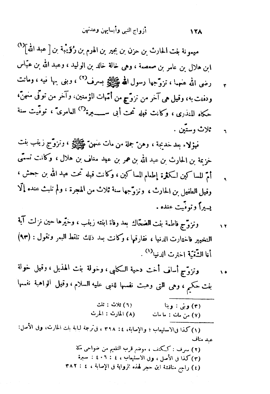 فهؤلاء بعد خديجة، وهنّ جملة من مات عنهنّ صلّى الله عليه وسلم، وتزوّج زينب بنت خزيمة بن الحارث بن عبد الله بن عمر بن عبد مناف بن هلال، وكانت تسمّى أمّ المساكين لكثرة إطعام المساكين، وكانت قبله تحت عبد الله بن جحش، وقيل الطفيل بن الحارث، وتزوّجها سنة ثلاث من الهجرة، ولم تلبث عنده، إلاّ يسيرا وتوفّيت عنده.