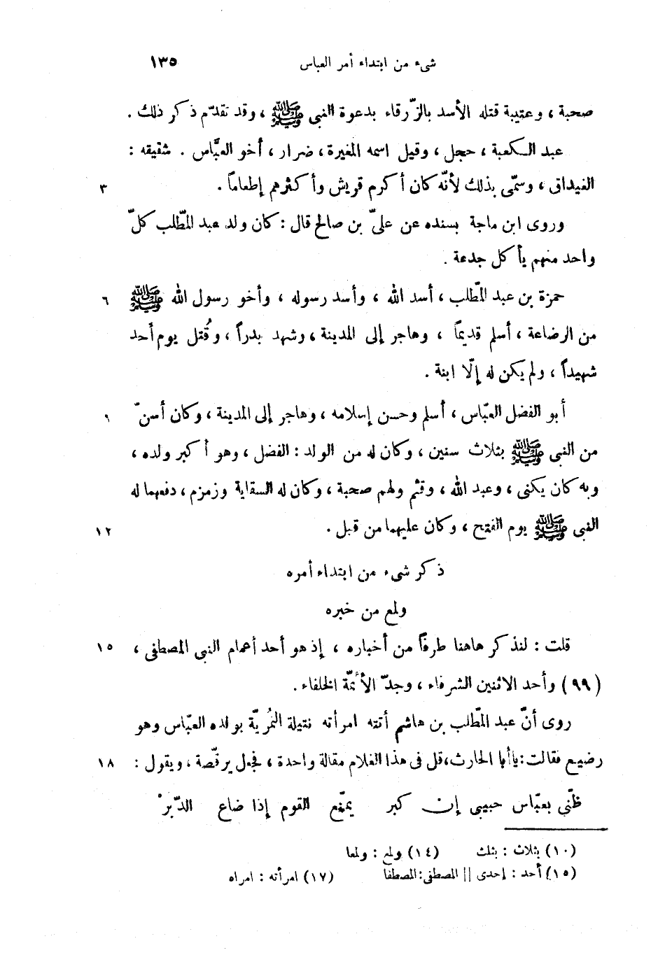 قلت: لنذكر هاهنا طرفا من أخباره، إذ هو أحد أعمام النبى المصطفى، (99) وأحد الاثنين الشرفاء، وجدّ الأئمّة الخلفاء.