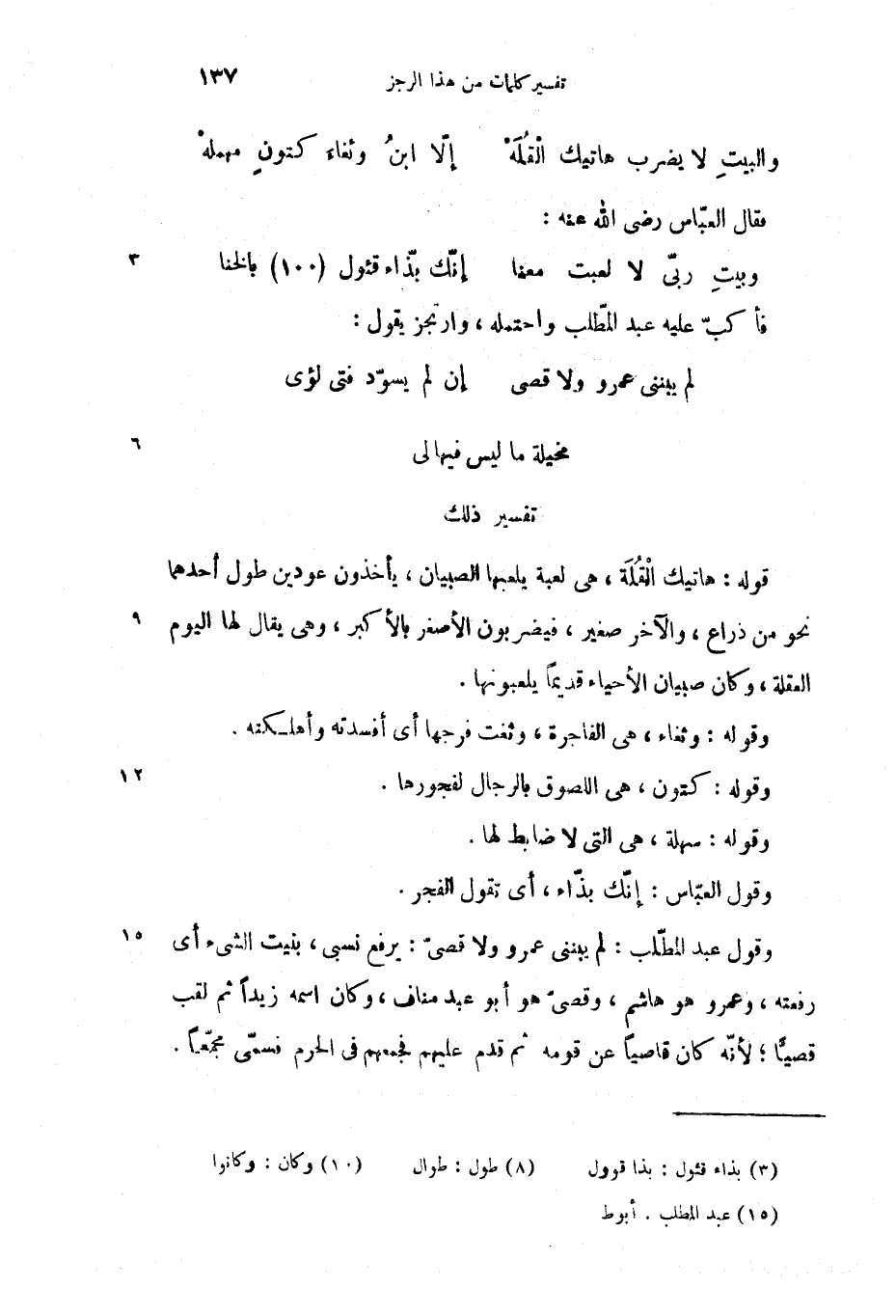 وقول عبد المطّلب: لم يبننى عمرو ولا قصىّ: يرفع نسبى، بنيت الشئ أى رفعته، وعمرو هو هاشم، وقصىّ هو أبو عبد مناف، وكان اسمه زيدا ثم لقب قصيّا؛ لأنّه كان قاصيا عن قومه ثم قدم عليهم فجمعهم فى الحرم فسمّى مجمّعا.