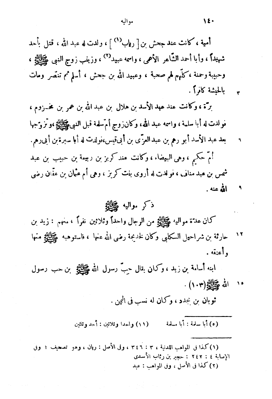 كان عدّة مواليه صلّى الله عليه وسلم من الرجال واحدا وثلاثين نفرا، منهم: زيد بن حارثة بن شراحيل الكلبى وكان لخديجة رضى الله عنها، فاستوهبه صلّى الله عليه وسلم منها وأعنقه.