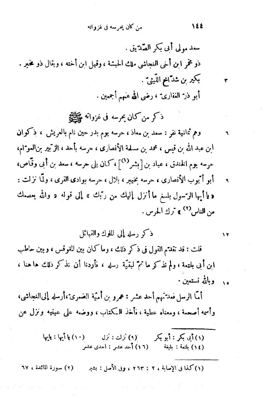 وهم ثمانية نفر: سعد بن معاذ، حرسه يوم بدر حين نام بالعريش، ذكوان ابن عبد الله بن قيس، محمد بن مسلمة الأنصارى، حرسه بأحد، الزّبير بن العوّام، حرسه يوم الخندق، عباد بن [بشر (1)]، كان يلى حرسه، سعد بن أبى وقّاص، أبو أيّوب الأنصارى، حرسه بخيبر، بلال، حرسه بوادى القرى، ولمّا نزلت: