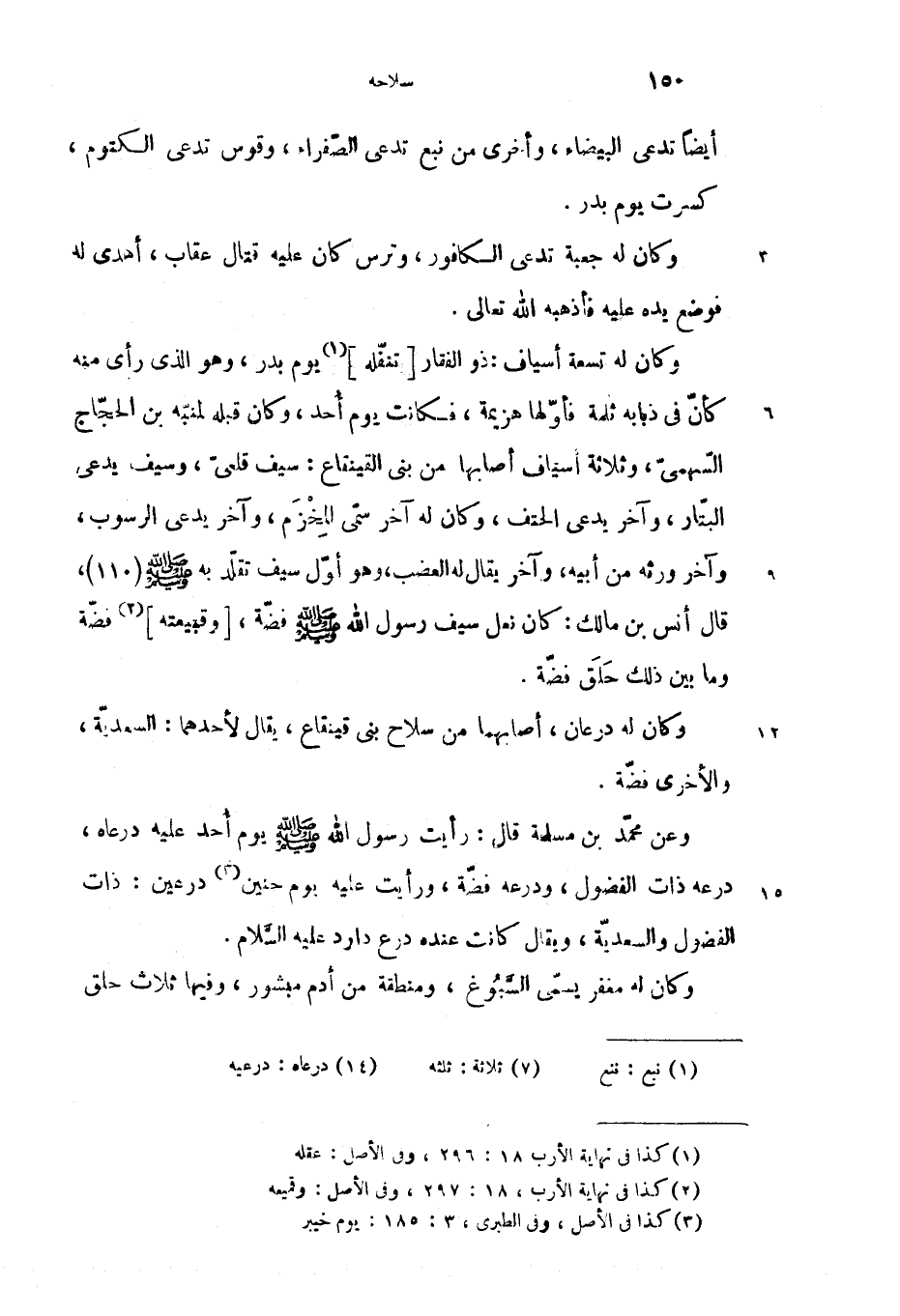 وكان له تسعة أسياف: ذو الفقار [تنفّله] (1) يوم بدر، وهو الذى رأى منه كأنّ فى ذبابه ثلمة فأوّلها هزيمة، فكانت يوم أحد، وكان قبله لمنبّه بن الحجّاج السّهمىّ، وثلاثة أسياف أصابها من بنى القينقاع: سيف قلعىّ، وسيف يدعى البتّار، وآخر يدعى الحتف، وكان له آخر سمّى المخزم، وآخر يدعى الرسوب، وآخر ورثه من أبيه، وآخر يقال له العضب، وهو أوّل سيف تقلّد به صلّى الله عليه وسلم (110)، قال أنس بن مالك: كان نعل سيف رسول الله صلّى الله عليه وسلم فضّة، [وقبيعته] (2) فضّة وما بين ذلك حلق فضّة.