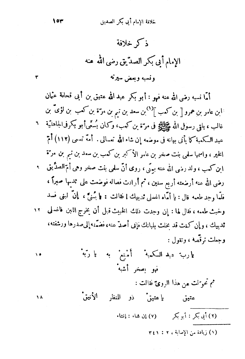 أمّا نسبه رضى الله عنه فهو: أبو بكر عبد الله عتيق بن أبى قحافة عثمان ابن عامر بن عمرو [بن كعب] (1) بن سعد بن تيم بن مرّة بن كعب بن لؤىّ بن غالب، يلقى رسول الله صلّى الله عليه وسلم فى مرّة بن كعب، وكان يسمّى أبو بكر فى الجاهليّة عبد الكعبة كما يأتى بيانه فى موضعه إن شاء الله تعالى. أمّه تسمى (112) أمّ الخير، واسمها سلمى بنت صخر بن عامر الأكبر بن كعب بن سعد بن تيم بن مرّة ابن كعب، ولد رضى الله عنه بمنى، روى أنّ سلمى بنت صخر وهى أمّ الصدّيق رضى الله عنه أرضعته أربع سنين، ثم أرادت فصاله فوضعت على ثديها صبرا، فلمّا وجد طعمه قال: يا أمّاه اغسلى ثدييك! فقالت: يا بنىّ، إنّ لبنى فسد وخبث طعمه، فقال لها: إن وجدت ذلك الخبيث قبل أن يخرج اللبن فاغسلى ثدييك، وإن كنت قد بخلت بلبانك فإنى أصدّ عنه، فضمّنه إلى صدرها ورشفته، وجعلت ترقّصه، وتقول: