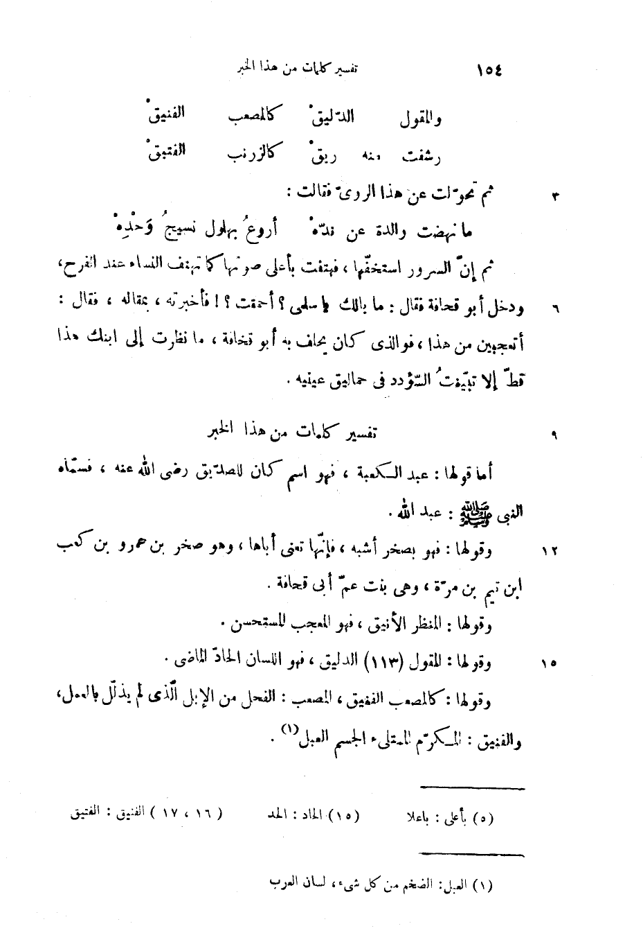 وقولها: كالمصعب الفنيق، المصعب: الفحل من الإبل الّذى لم يذلّل بالعمل، والفنيق: المكرّم الممتلئ الجسم العبل (1).