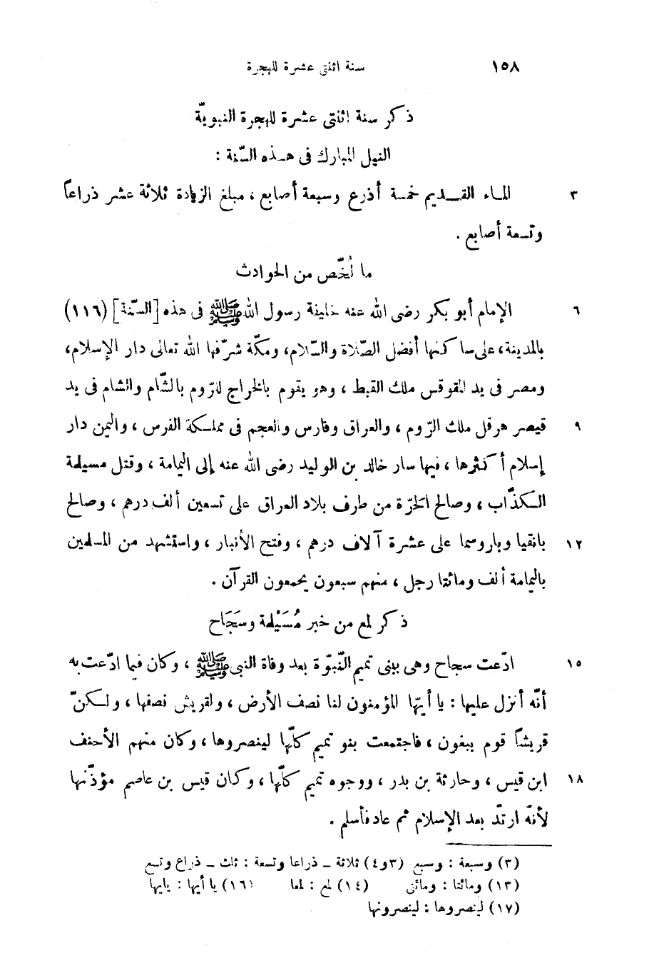 الإمام أبو بكر رضى الله عنه خليفة رسول الله صلّى الله عليه وسلم فى هذه [السّنة] (116) بالمدينة، على ساكنها أفضل الصّلاة والسّلام، ومكّة شرّفها الله تعالى دار الإسلام، ومصر فى يد المقوقس ملك القبط، وهو يقوم بالخراج للرّوم بالشّام والشام فى يد قيصر هرقل ملك الرّوم، والعراق وفارس والعجم فى مملكة الفرس، واليمن دار إسلام أكثرها، فيها سار خالد بن الوليد رضى الله عنه إلى اليمامة، وقتل مسيلمة الكذّاب، وصالح الحرّة من طرف بلاد العراق على تسعين ألف درهم، وصالح بانقيا وباروسما على عشرة آلاف درهم، وفتح الأنبار، واستشهد من المسلمين باليمامة ألف ومائتا رجل، منهم سبعون يحمعون القرآن.
