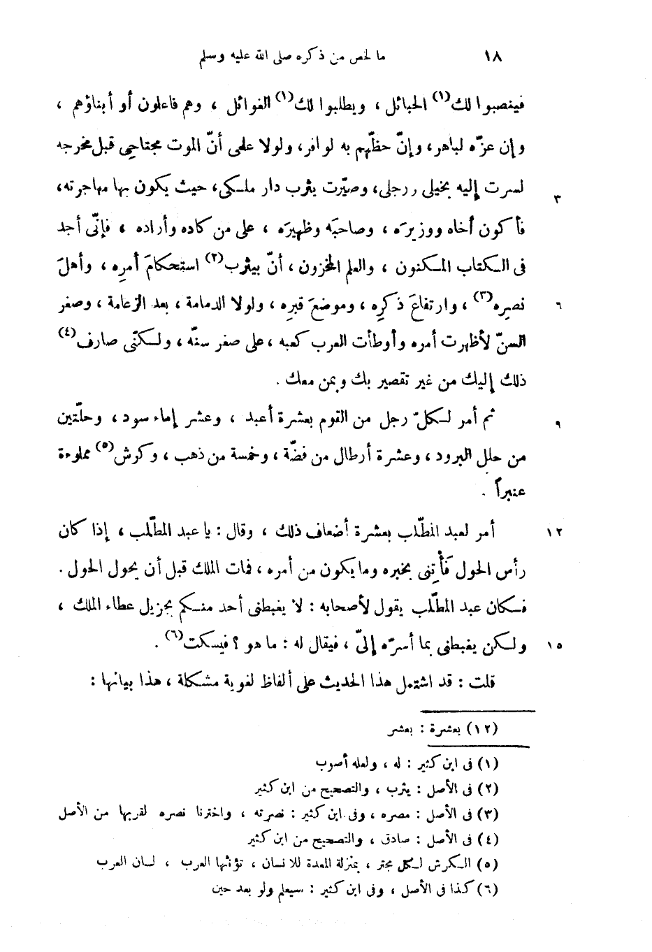أمر لعبد المطّلب بعشرة أضعاف ذلك، وقال: يا عبد المطّلب، إذا كان رأس الحول فأتنى بخبره وما يكون من أمره، فمات الملك قبل أن يحول الحول فكان عبد المطّلب يقول لأصحابه: لا يغبطنى أحد منكم بجزيل عطاء الملك، ولكن يغبطنى بما أسرّه إلىّ، فيقال له: ما هو؟ فيسكت (6).