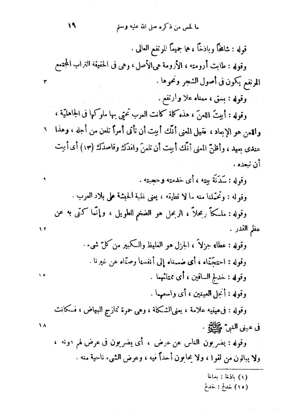 وقوله: أبيت اللعن، هذه كلمة كانت العرب تحيّى بها ملوكها فى الجاهليّة، واللعن هو الإبعاد، فقيل المعنى أنّك أبيت أن تأتى أمرا تلعن من أجله، وهذا عندى بعيد، وأظنّ المعنى أنّك أبيت أن تلعن وافدك وقاصدك (13) أى أبيت أن تبعده.