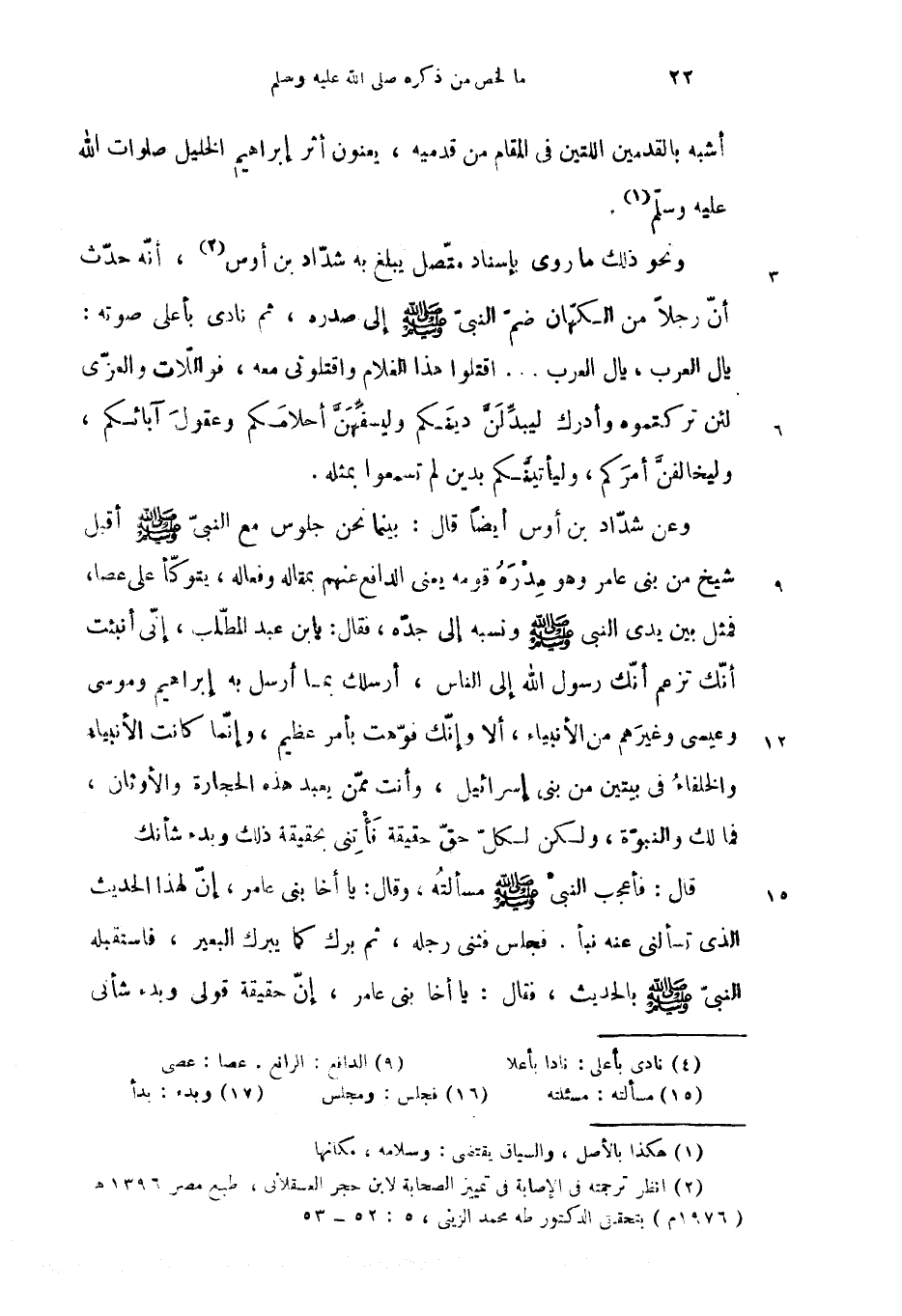 وعن شدّاد بن أوس أيضا قال: بينما نحن جلوس مع النبىّ صلّى الله عليه وسلم أقبل شيخ من بنى عامر وهو مدره قومه يعنى الدافع عنهم بمقاله وفعاله، يتوكّأ على عصا، فمثل بين يدى النبى صلّى الله عليه وسلم ونسبه إلى جدّه، فقال: يا بن عبد المطّلب، إنّى أنبئت أنّك تزعم أنّك رسول الله إلى الناس، أرسلك بما أرسل به إبراهيم وموسى وعيسى وغيرهم من الأنبياء، ألا وإنّك فوّهت بأمر عظيم، وإنّما كانت الأنبياء والخلفاء فى بيتين من بنى إسرائيل، وأنت ممّن يعبد هذه الحجارة والأوثان، فما لك والنبوّة، ولكن لكلّ حقّ حقيقة مأتنى بحقيقة ذلك وبدء شأنك