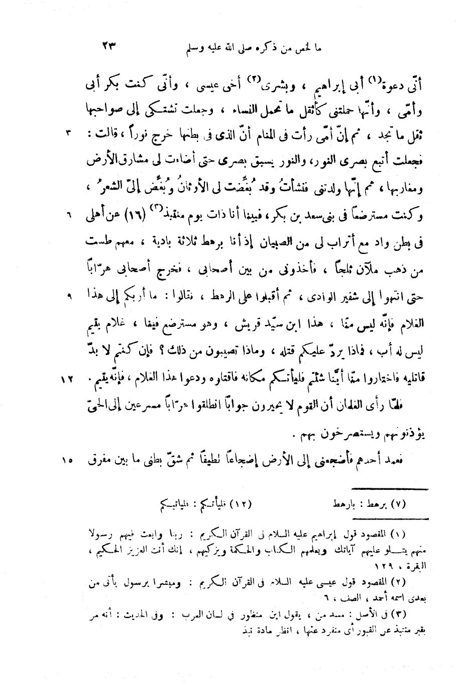 أنّى دعوة (1) أبى إبراهيم، وبشرى (2) أخى عيسى، وأنّى كنت بكر أبى وأمّى، وأنّها حملتنى كأثقل ما تحمل النساء، وجعلت تشتكى إلى صواحبها ثقل ما تجد، ثم إنّ أمّى رأت فى المنام أنّ الذى فى بطنها خرج نورا، قالت: