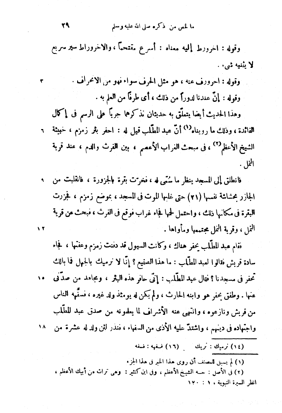 فقام عبد المطّلب يحفر هناك، وكانت السيول قد دفنت زمزم وعفتها، فجاء سادة قريش فقالوا لعبد المطّلب: ما هذا الصنيع؟ إنّا لا نرميك بالجهل فما بالك تحفر فى مسجدنا؟ فقال عبد المطّلب: إنّى حافر هذه البئر، ومجاهد من صدّنى عنها. وطفق يحفر هو وابنه الحارث، ولم يكن له يومئذ ولد غيره، فسفّهه الناس من قريش ونازعوه، وانتهى عنه الأشراف لما يعلمونه من صدق عبد المطّلب واجتهاده فى دينهم، واشتدّ عليه الأذى من السفهاء، فنذر لئن ولد له عشرة من