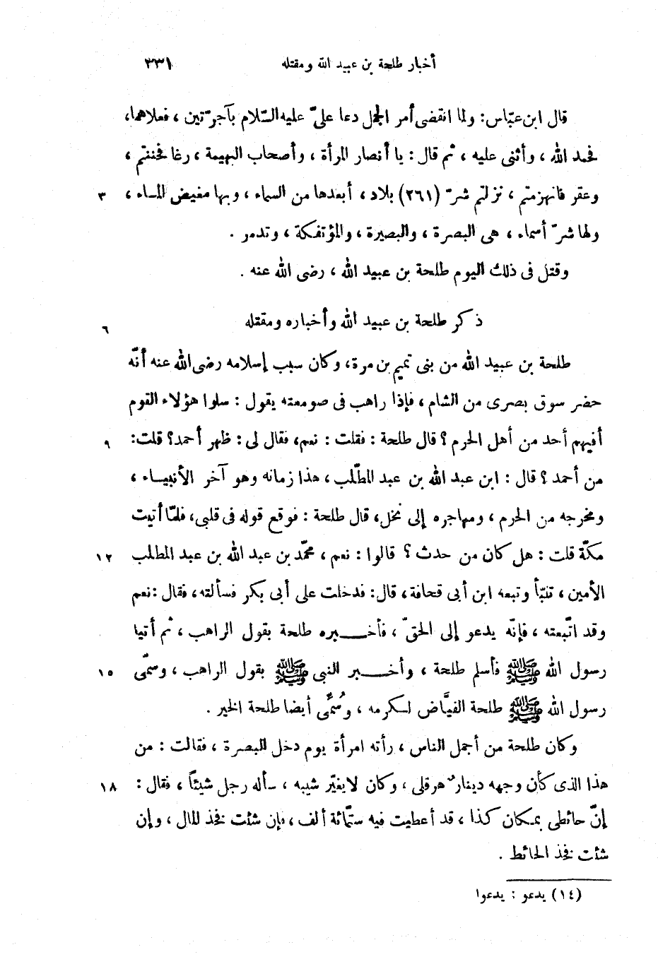 من أحمد؟ قال: ابن عبد الله بن عبد المطّلب، هذا زمانه وهو آخر الأنبياء، ومخرجه من الحرم، ومهاجره إلى نخل، قال طلحة: فوقع قوله فى قلبى، فلمّا أتيت مكّة قلت: هل كان من حدث؟ قالوا: نعم، محمّد بن عبد الله بن عبد المطلب الأمين، تنبّأ وتبعه ابن أبى قحافة، قال: فدخلت على أبى بكر فسألته، فقال: نعم وقد اتّبعته، فإنّه يدعو إلى الحقّ، فأخبره طلحة بقول الراهب، ثم أتيا رسول الله صلّى الله عليه وسلم فأسلم طلحة، وأخبر النبى صلّى الله عليه وسلم بقول الراهب، وسمّى رسول الله صلّى الله عليه وسلم طلحة الفيّاض لكرمه، وسمّى أيضا طلحة الخير.