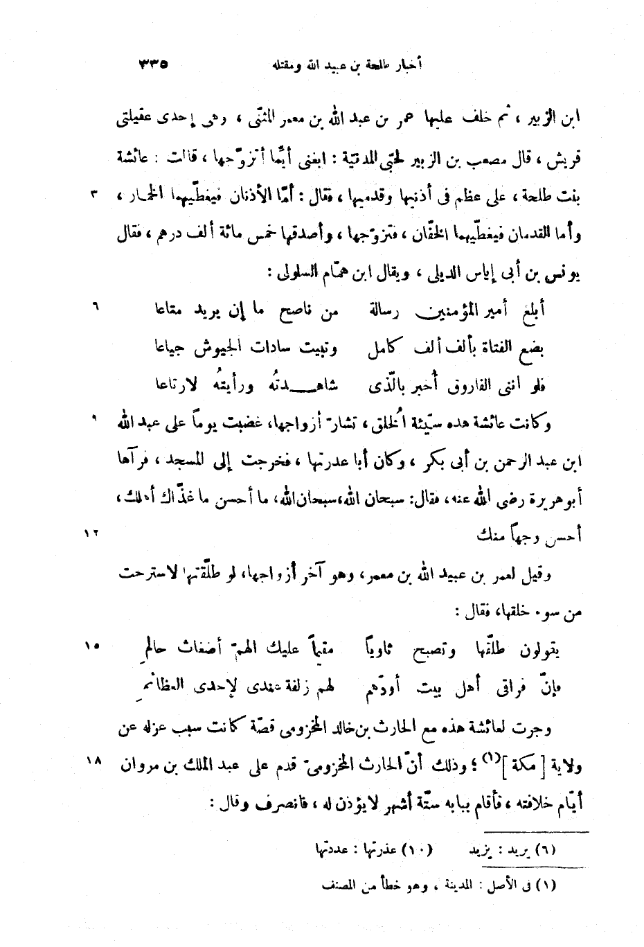 ابن الزبير، ثم خلف عليها عمر بن عبد الله بن معمر المثنّى، وهى إحدى عقيلتى قريش، قال مصعب بن الزبير لحبىّ المدنيّة: ابغنى أيّما أتزوّجها، قالت: عائشة بنت طلحة، على عظم فى أذنيها وقدميها، فقال: أمّا الأذنان فيغطّيهما الخمار، وأما القدمان فيغطّيهما الخفّان، فتزوّجها، وأصدقها خمس مائة ألف درهم، فقال يونس بن أبى إياس الديلى، ويقال ابن همّام السلولى: