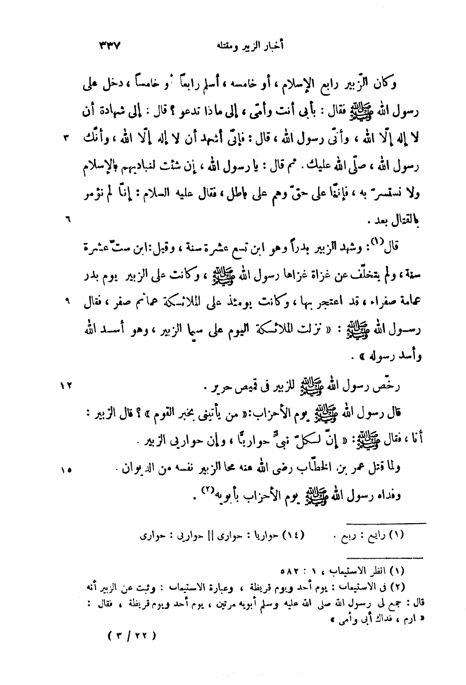 وكان الزّبير رابع الإسلام، أو خامسه، أسلم رابعا أو خامسا، دخل على رسول الله صلّى الله عليه وسلم فقال: بأبى أنت وأمّى، إلى ماذا تدعو؟ قال: إلى شهادة أن لا إله إلاّ الله، وأنّى رسول الله، قال: فإنّى أشهد أن لا إله إلاّ الله، وأنّك رسول الله، صلّى الله عليك. ثم قال: يا رسول الله، إن شئت لنباديهم بالإسلام ولا نستسرّ به، فإننّا على حقّ وهم على باطل، فقال عليه السلام: إنّا لم نؤمر بالقتال بعد.