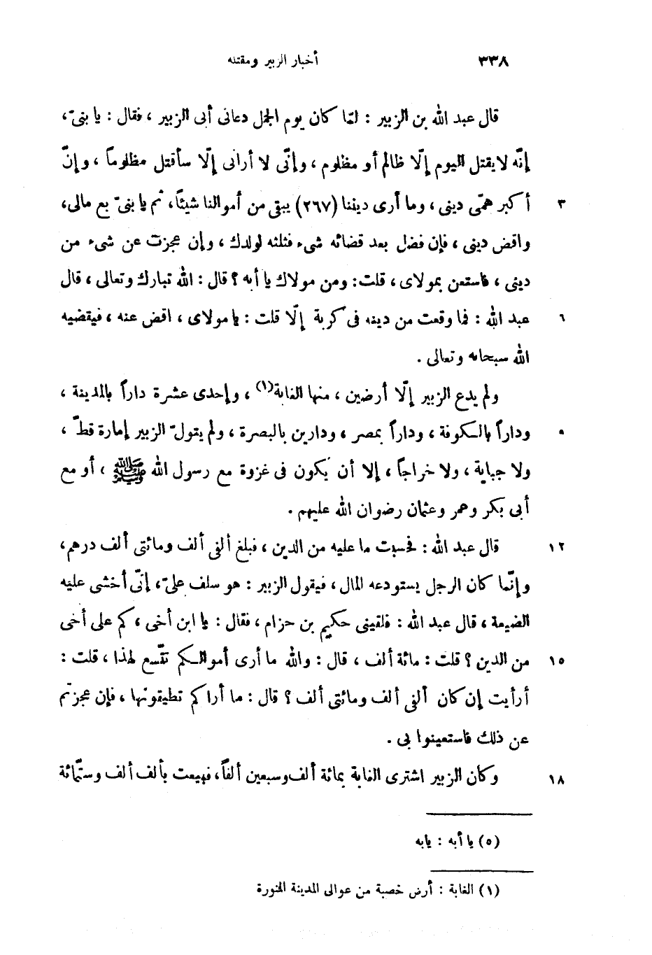 ولم يدع الزبير إلاّ أرضين، منها الغابة (1)، وإحدى عشرة دارا بالمدينة، ودارا بالكوفة، ودارا بمصر، ودارين بالبصرة، ولم يتولّ الزبير إمارة قطّ، ولا جباية، ولا خراجا، إلا أن يكون فى غزوة مع رسول الله صلّى الله عليه وسلم، أو مع أبى بكر وعمر وعثمان رضوان الله عليهم.