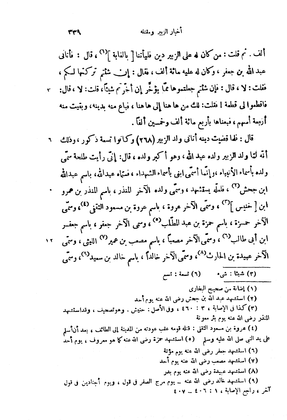 قال: فلما قضيت دينه أتانى ولد الزبير (268) وكانوا تسعة ذكور، وذلك أنّه لمّا ولد الزبير ولده عبد الله، وهو أكبر ولده، قال: إنّى رأيت طلحة سمّى ولده بأسماء الأنبياء، وإنّما أسمّى ابنى بأسماء الشهداء، فسمّاه عبد الله، باسم عبد الله ابن جحش (2)، فلعلّه يستشهد، وسمّى ولده الآخر المنذر، باسم المنذر بن عمرو ابن [خنيس] (3)، وسمّى الآخر عروة، باسم عروة بن مسعود الثقفى (4)، وسمّى الآخر حمزة، باسم حمزة بن عبد المطّلب (5)، وسمى الآخر جعفر، باسم جعفر ابن أبى طالب (6)، وسمّى الآخر مصعبا، باسم مصعب بن عمير (7) الليثى، وسمّى الآخر عبيدة بن الحارث (8)، وسمّى الآخر خالدا، باسم خالد بن سعيد (9)، وسمّى