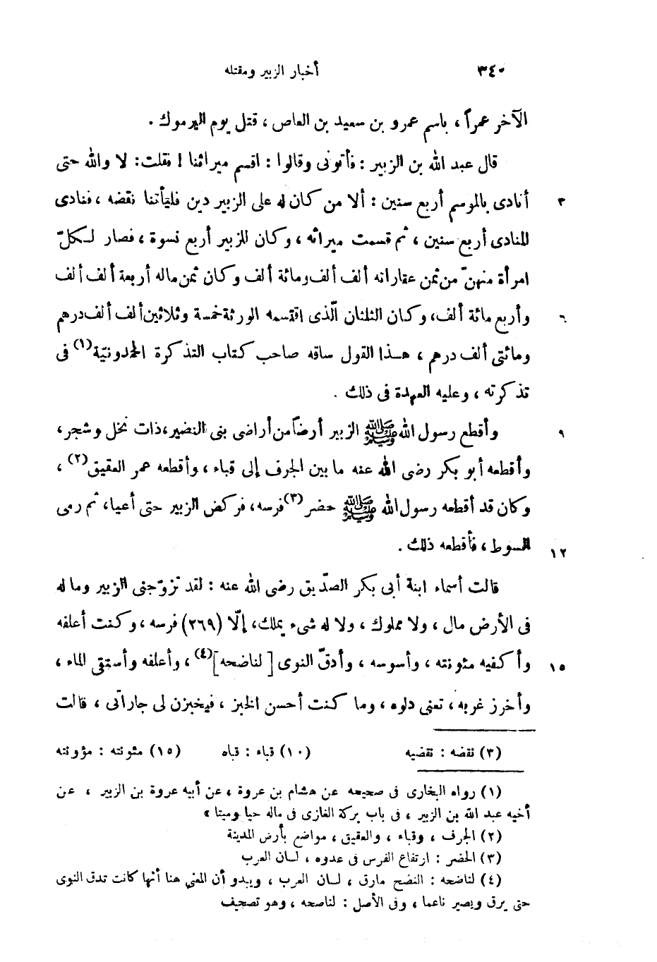 قال عبد الله بن الزبير: فأتونى وقالوا: اقسم ميراثنا! فقلت: لا والله حتى أنادى بالموسم أربع سنين: ألا من كان له على الزبير دين فليأتنا نقضه، فنادى المنادى أربع سنين، ثم قسمت ميراثه، وكان الزبير أربع نسوة، فصار لكلّ امرأة منهنّ من ثمن عقاراته ألف ألف ومائة ألف وكان ثمن ماله أربعة ألف ألف وأربع مائة ألف، وكان الثلثان الّذى اقتسمه الورثة خمسة وثلاثين ألف ألف درهم ومائتى ألف درهم، هذا القول ساقه صاحب كتاب التذكرة الحمدونيّة (1) فى تذكرته، وعليه العهدة فى ذلك.