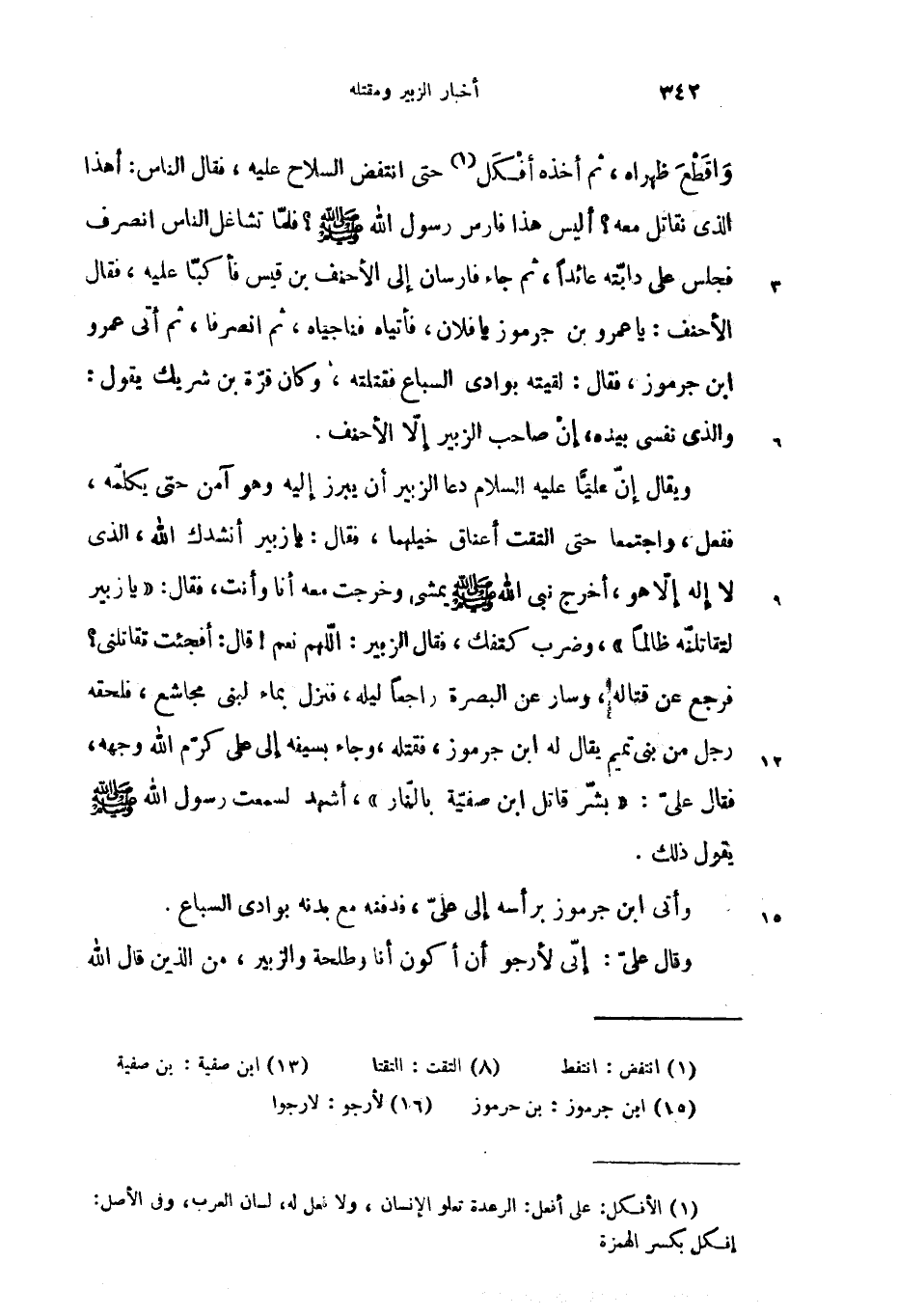 ويقال إنّ عليّا عليه السلام دعا الزبير أن يبرز إليه وهو آمن حتى يكلّمه، ففعل، واجتمعا حتى التقت أعناق خيلهما، فقال: يا زبير أنشدك الله، الذى لا إله إلاّ هو، أخرج نبى الله صلّى الله عليه وسلم يمشى وخرجت معه أنا وأنت، فقال: «يا زبير لتقاتلنّه ظالما»، وضرب كتفك، فقال الزبير: الّلهم نعم! قال: أفجئت تقاتلنى؟ فرجع عن قتاله، وسار عن البصرة راجعا ليله، فنزل بماء لبنى مجاشع، فلحقه رجل من بنى تميم يقال له ابن جرموز، فقتله، وجاء بسيفه إلى على كرّم الله وجهه، فقال علىّ: «بشّر قاتل ابن صفيّة بالنّار»، أشهد لسمعت رسول الله صلّى الله عليه وسلم يقول ذلك.