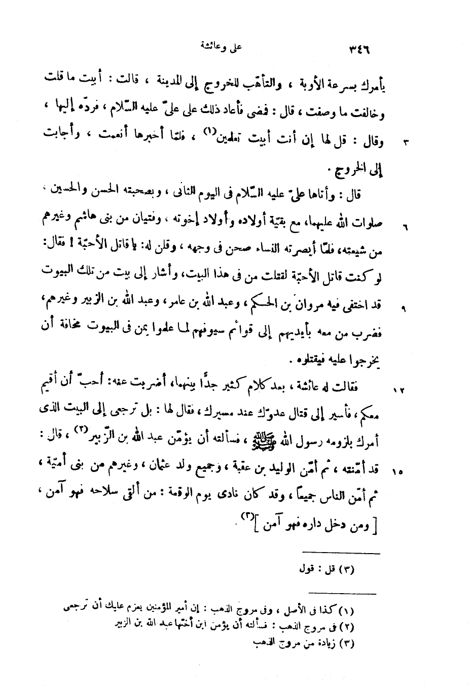 فقالت له عائشة، بعد كلام كثير جدّا بينهما، أضربت عنه: أحبّ أن أقيم معكم، فأسير إلى قتال عدوّك عند مسيرك، فقال لها: بل ترجعى إلى البيت الذى أمرك بلزومه رسول الله صلّى الله عليه وسلم، فسألته أن يؤمّن عبد الله بن الزّبير (2)، قال: