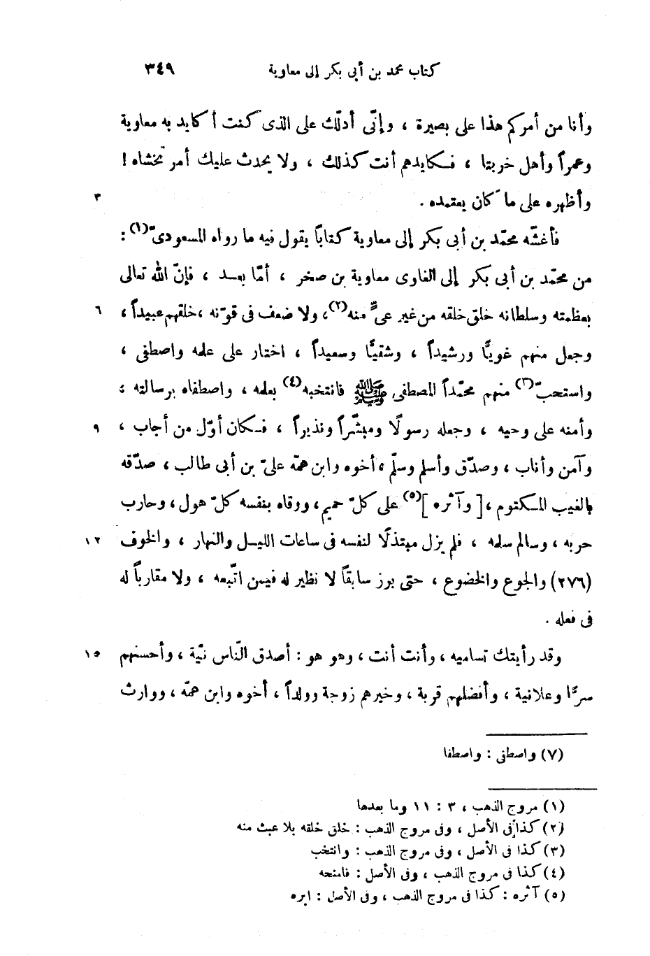 من محمّد بن أبى بكر إلى الغاوى معاوية بن صخر، أمّا بعد، فإنّ الله تعالى بعظمته وسلطانه خلق خلقه من غير عىّ منه (2)، ولا ضعف فى قوّته، خلقهم عبيدا، وجعل منهم غويّا ورشيدا، وشقيّا وسعيدا، اختار على علمه واصطفى، واستحبّ (3) منهم محمّدا المصطفى صلّى الله عليه وسلم فانتخبه (4) بعلمه، واصطفاه برسالته، وأمنه على وحيه، وجعله رسولا ومبشّرا ونذيرا، فكان أوّل من أجاب، وآمن وأناب، وصدّق وأسلم وسلّم، أخوه وابن عمّه علىّ بن أبى طالب، صدّقه بالغيب المكتوم، [وآثره] (5) على كلّ حميم، ووقاه بنفسه كلّ هول، وحارب حربه، وسالم سلمه، فلم يزل مبتذلا لنفسه فى ساعات الليل والنهار، والخوف (276) والجوع والخضوع، حتى برز سابقا لا نظير له فيمن اتّبعه، ولا مقاربا له فى فعله.