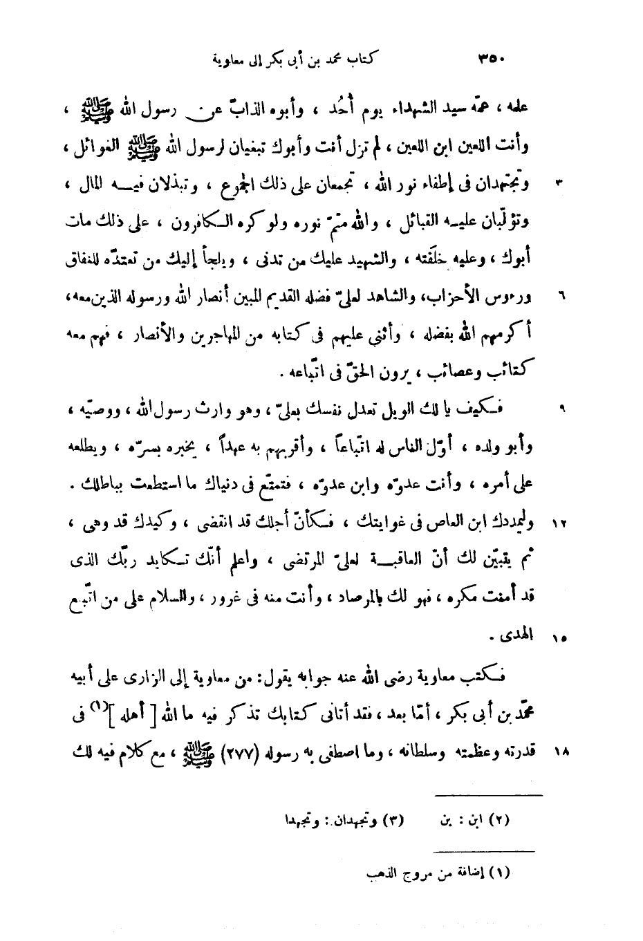 فكتب معاوية رضى الله عنه جوابه يقول: من معاوية إلى الزارى على أبيه محمّد بن أبى بكر، أمّا بعد، فقد أتانى كتابك تذكر فيه ما الله [أهله] (1) فى قدرته وعظمته وسلطانه، وما اصطفى به رسوله (277) صلّى الله عليه وسلم، مع كلام فيه لك