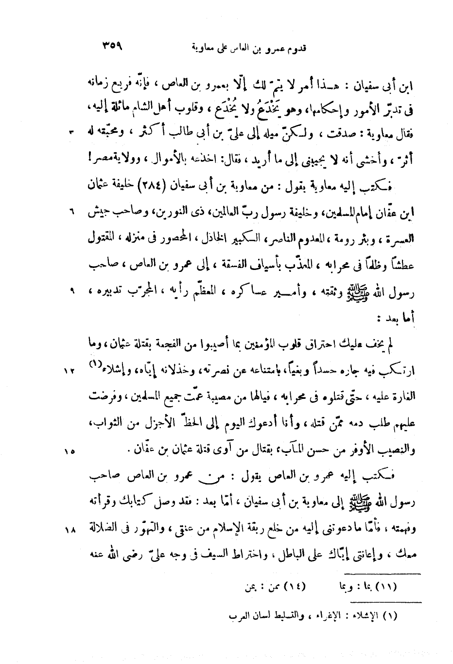فكتب إليه معاوية يقول: من معاوية بن أبى سفيان (284) خليفة عثمان ابن عفّان إمام المسلمين، وخليفة رسول ربّ العالمين، ذى النورين، وصاحب جيش العسرة، وبئر رومة، المعدوم الناصر، الكبير الخادل، المحصور فى منزله، المقتول عطشا وظلما فى محرابه، المعذّب بأسياف الفسقة، إلى عمرو بن العاص، صاحب رسول الله صلّى الله عليه وسلم وثقته، وأمير عساكره، المعظّم رأيه، المجرّب تدبيره، أما بعد: