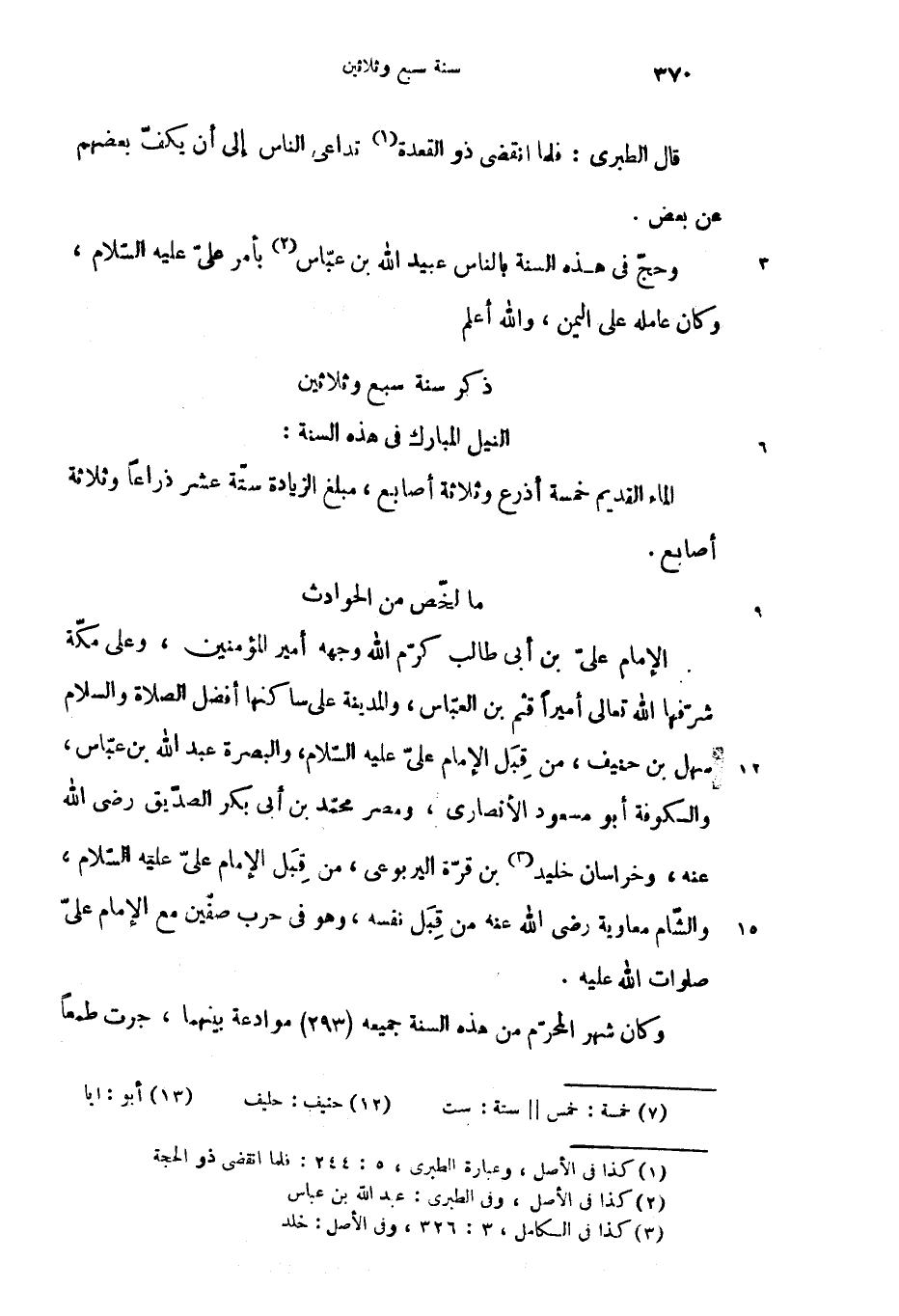 الإمام علىّ بن أبى طالب كرّم الله وجهه أمير المؤمنين، وعلى مكّة شرّفها الله تعالى أميرا قثم بن العبّاس، والمدينة على ساكنها أفضل الصلاة والسلام سهل بن حنيف، من قبل الإمام علىّ عليه السّلام، والبصرة عبد الله بن عبّاس، والكوفة أبو مسعود الأنصارى، ومصر محمّد بن أبى بكر الصدّيق رضى الله عنه، وخراسان خليد (3) بن قرّة اليربوعى، من قبل الإمام علىّ عليه السّلام، والشّام معاوية رضى الله عنه من قبل نفسه، وهو فى حرب صفّين مع الإمام علىّ صلوات الله عليه.